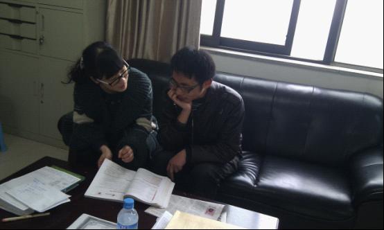 2012年3月16日中午,行政楼外语系1102办公室正展开一次英语辅导活动,经管系会计1103班的英语老师黄蓉正在细心地给本班“马路孝子”刘普林同学辅导功课。为了让刘普林在参加社会活动的同时,保持良好的学习成绩,顺利通过四六级,外语系安排黄蓉老师为他辅导英语。