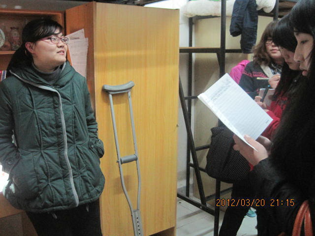 与此同时,我们还采访了刘煦同学的好朋友兼室友—宫程鑫同学。在宫程鑫的眼中,刘煦同学除了腿脚有点不便之外,在学习上和人生态度上都很值得她学习。宫程鑫说:“刘煦不论做什么都很有计划和条理,最让我佩服的就是她坚持不懈的品格。刘煦能获得这次评比的机会也是和她的努力息息相关的,更是她应得的”。