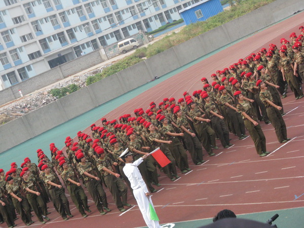 场上的军队整装待发,在总指挥向首长汇报了情况之后,阅兵正式开始!“同学们好”,“首长好”,“同学们辛苦了”,“为人民服务”。在首长的检阅中,呼声阵阵响起,场上一片欢腾!随着音乐声的响起,方阵起步走来!首先出场的就是外语系,“巾帼不让须眉”尽管这一方队全是女生,但是她们踏着整齐的步伐,喊着响亮的口号,铿锵有力,英姿飒爽!“天高任鸟飞,海阔凭鱼跃”各系方阵依次行进,主席台上掌声阵阵!之后进行的是军体拳表演,精彩绝伦,全场掌声连连!