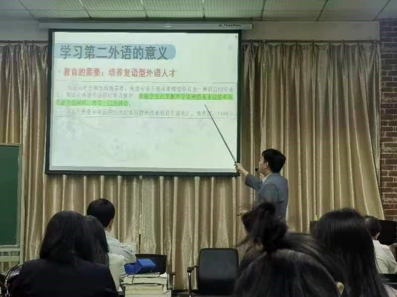 最后出场的杜爽老师展示了他本学期的开学第一课——《第二外语(日语)》导学。好的开始是成功的一半,磨刀不误砍柴工,从课程设计上讲,为英语专业的学生们开设长达三个学期的二外课程,系好“第一颗纽扣”是非常有必要的。杜老师循循善诱,着力解决学生们在课程初始之际一定会产生的隐秘问题,为新知识的曙光照进心灵提前开好一扇窗,可谓用心良苦。