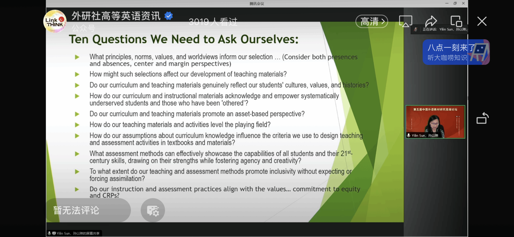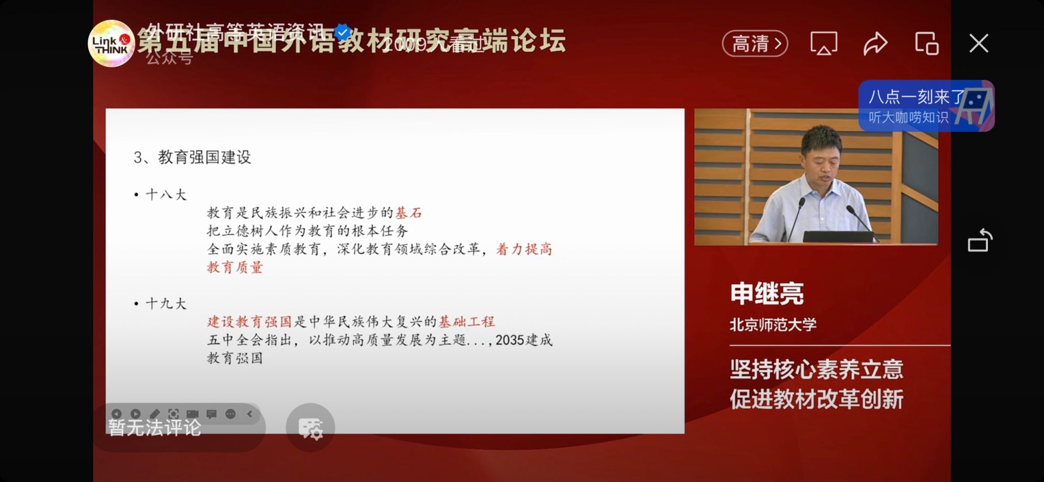 本次论坛的主要目的在于从学生的角度,讨论外语教材的发展,如何促进教育公平。习近平总书记在2016年“全国高校思想政治工作会议”上提出,“教材建设是育人育材的重要依托。建设什么样的教材体系,核心教材传授什么内容、倡导什么价值,体现国家意志,是国家事权。” 教材不仅是教学工具,教材应该起到育人的作用,提高学生对国家的认同,对中国民族文化共同体的认识。