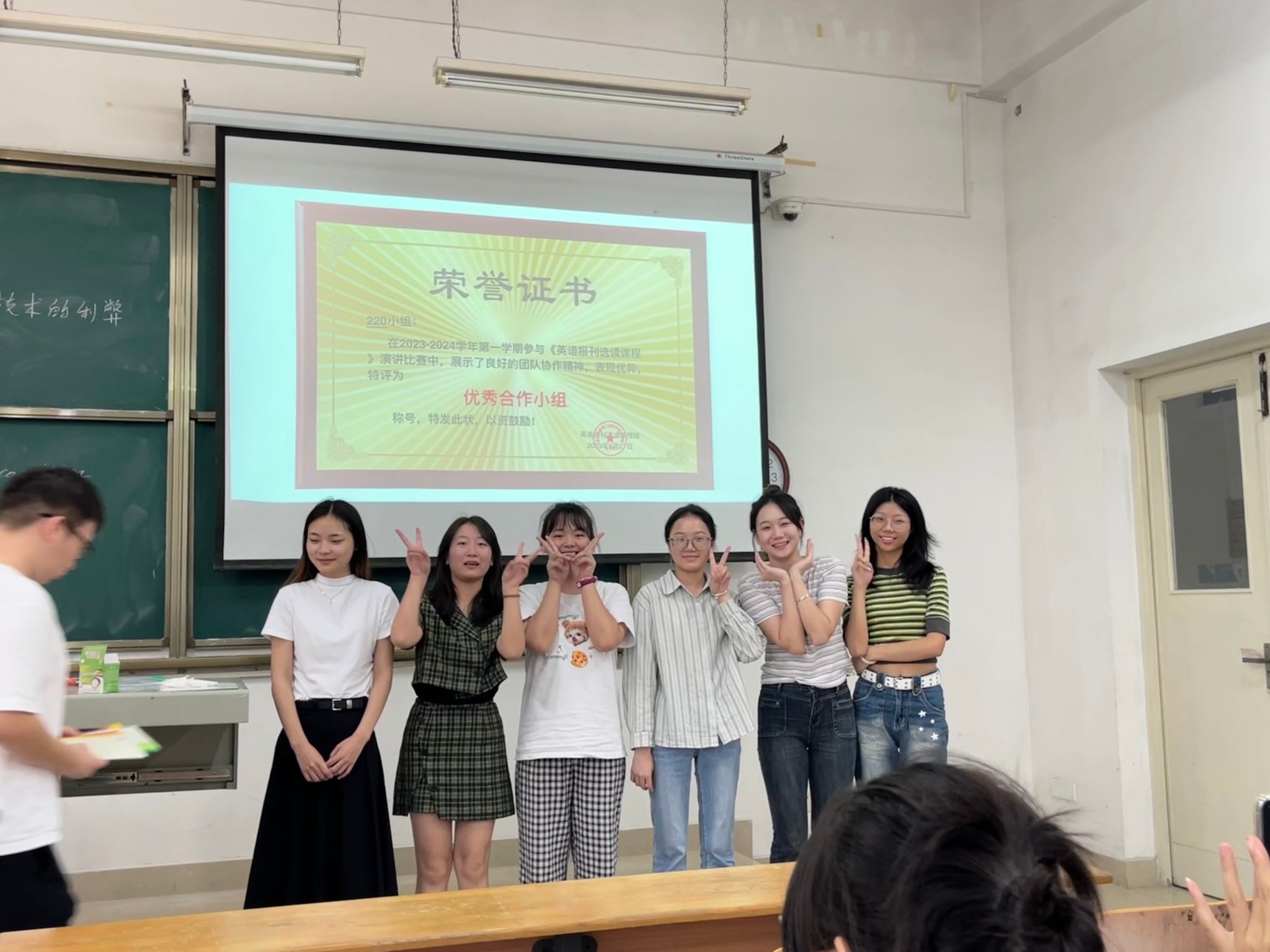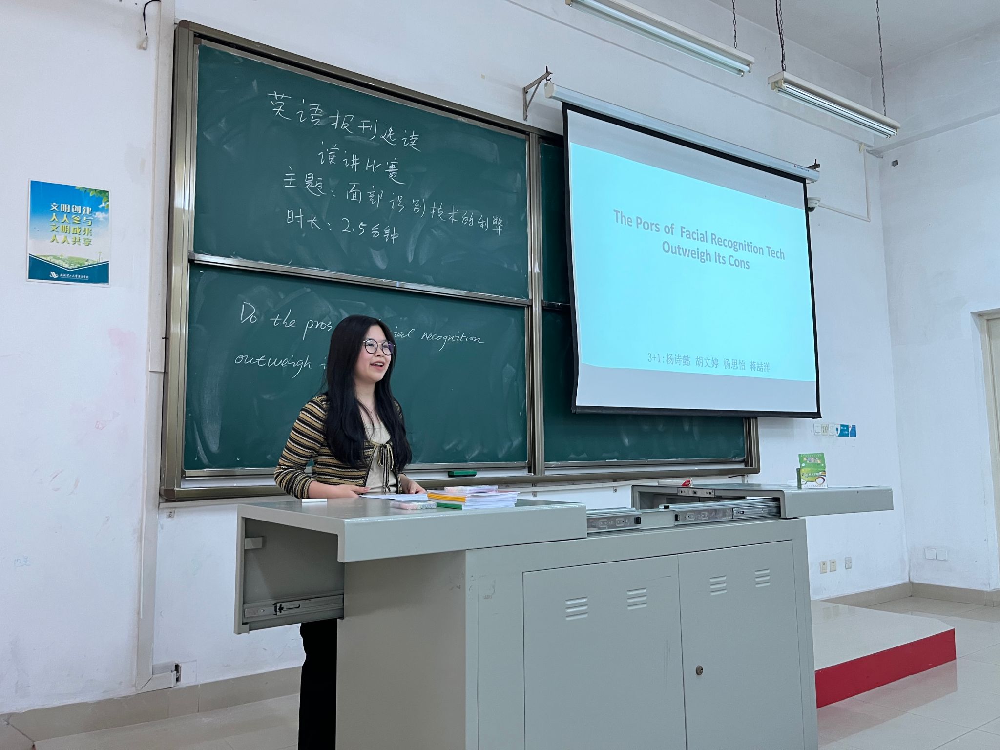 9月27日,《英语报刊选读(人文)》课程公共演讲比赛活动在凉爽的秋日如约而至,《英语报刊选读(人文)》的思政课程目标之一就是锻炼学生的思辨能力,表达能力,小组合作能力和解决问题的能力。第一单元的课文内容主题是面部识别技术,为了帮助同学们更好的认识这一先进的技术给人们生活带来的利与弊,课程组陈丹丹老师和吴珍妮老师精心设计了演讲比赛,让同学们在充分理解新闻文章的基础上,对文章的内容进行扩展,在提升语言能力的基础之上,对时政话题有更进一步的分析,提升学生们的分析能力。为了保证演讲比赛的顺利进行,课程老师课前就在超星学习通上设置了小组任务,进行分组和评分标准,小组表现的评价部分分为教师评价(10%)、组间评价(60%)、组内评价(25%)和自评(5%),经过现场抽签,个人展示和评分环节,最终选出了优秀合作小组和优秀演讲选手。演讲者表示通过这次比赛,她们的思辨能力和表达能力都得到了充分的锻炼,当然也存在一些表达方面的不足,例如紧张等原因。没有代表小组发言的同学们认为,尽管她们没有发言,但在收集资料的过程中,和队友的交流和沟通的机会都大大增加,沟通和交流的过程更有利于能力的锻炼和成长。她们表示,没想到在《英语报刊选读(人文)》课程中能锻炼到自己的思辨、