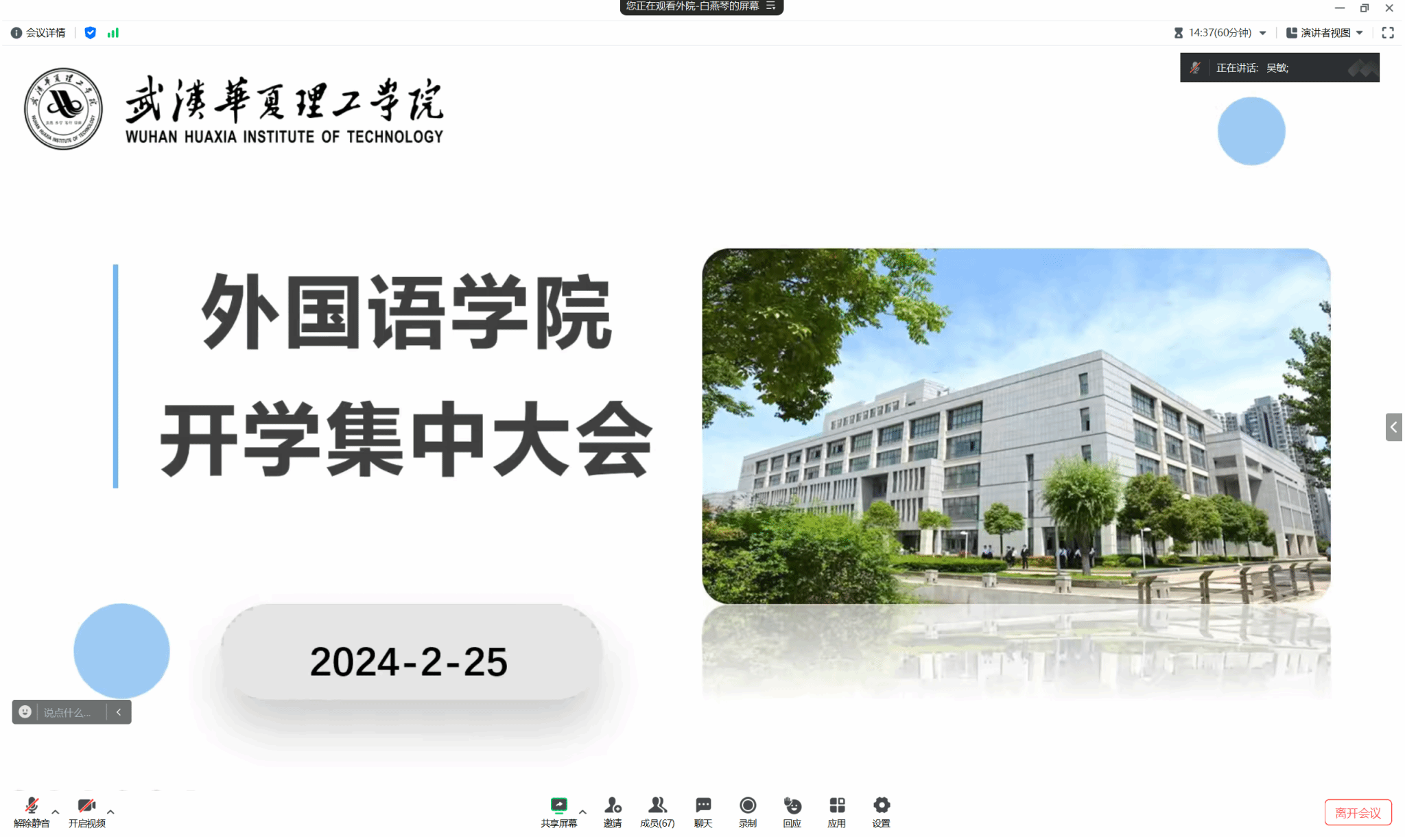 为谋新篇开新局,确保我院在新学期开学工作平稳有序进行,2月25日上午,外国语学院召开了线上学院全体教职工大会。会议由白燕琴副院长主持。