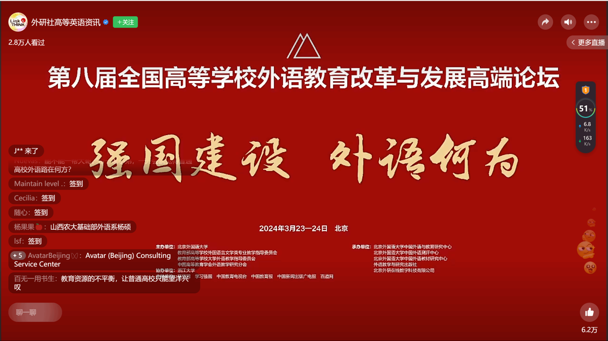 春潮澎湃起,扬帆正当时。2024年3月23日星期六8:30,第八届全国高等学校外语教育改革与发展高端论坛于北京顺利开场。会议当天除2000余位高等外语教育界专家学者齐聚北京外,全国各地的高等外语教育同仁相约云端,共襄盛会,共绘图景,共谋大计。我院大英部的老师们也纷纷于线上观摩了此次高端论坛。