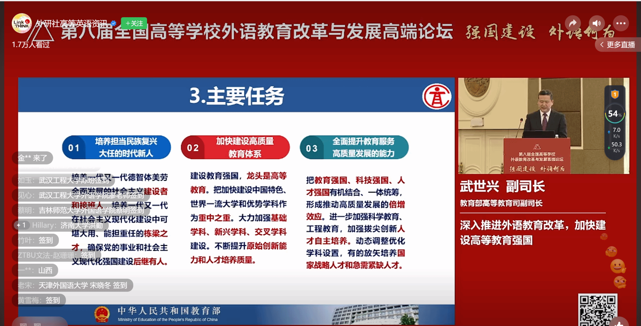 会上,除中国外语教育界的教授大咖们发表了专题演讲外,教育部高等教育武世兴也在论坛伊始向场内及线上的外语人们作了“深入推进外语教育改革,加快建设高等教育强国”的主旨报告,不仅为中国高等学校外语教育今后的发展指引了方向,同时也为身为一线的外语教师们绘制了未来工作的前景与目标。