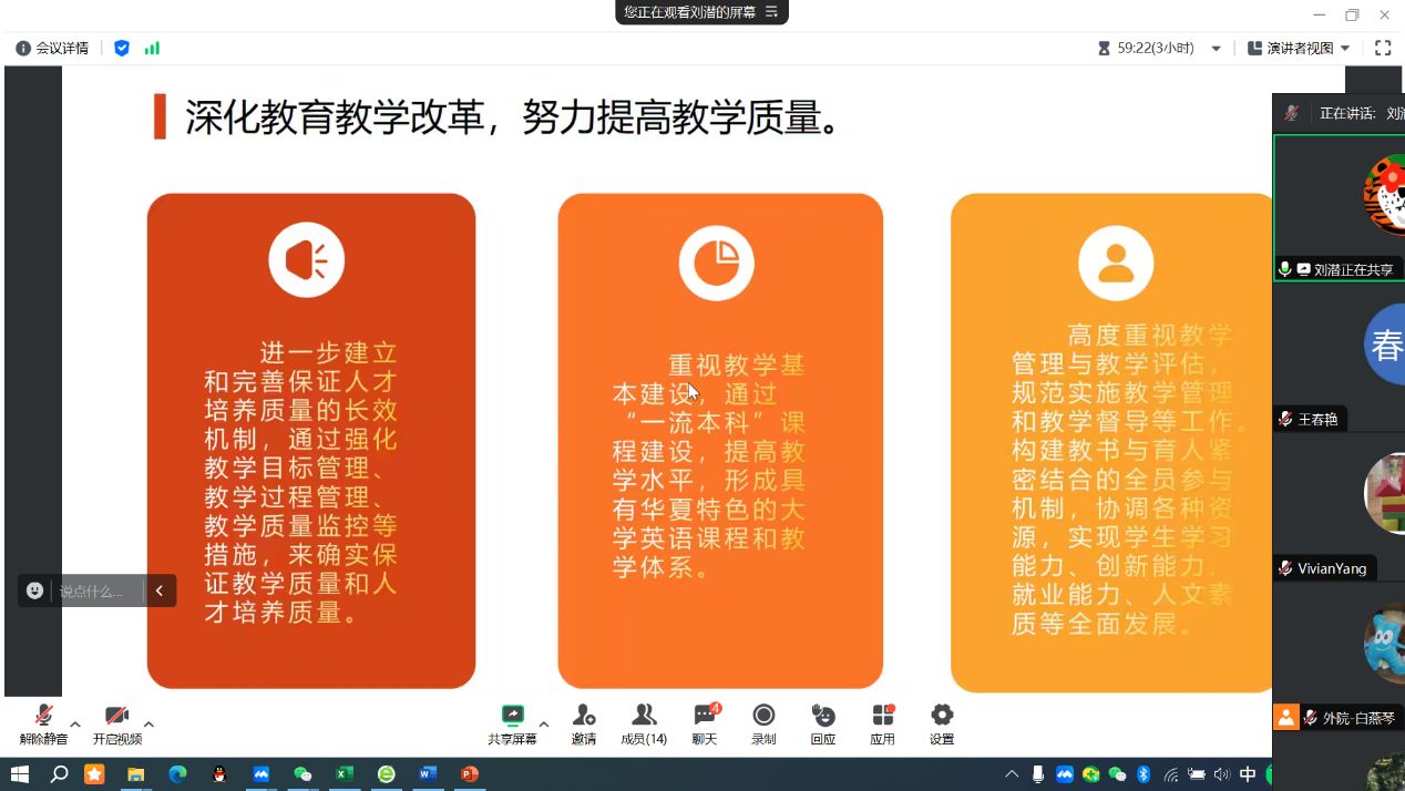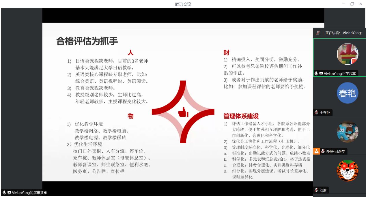 学工部杨洋主任围绕评估指标中的学风建设与学生指导做了汇报,内容主要包括三个方面。第一,细化学风建设方案,提供政策制度保障。第二,建设“书香外语”,充分发挥朋辈引领作用。第三,培养“外语+”复合人才,发挥第二课堂育人功效。