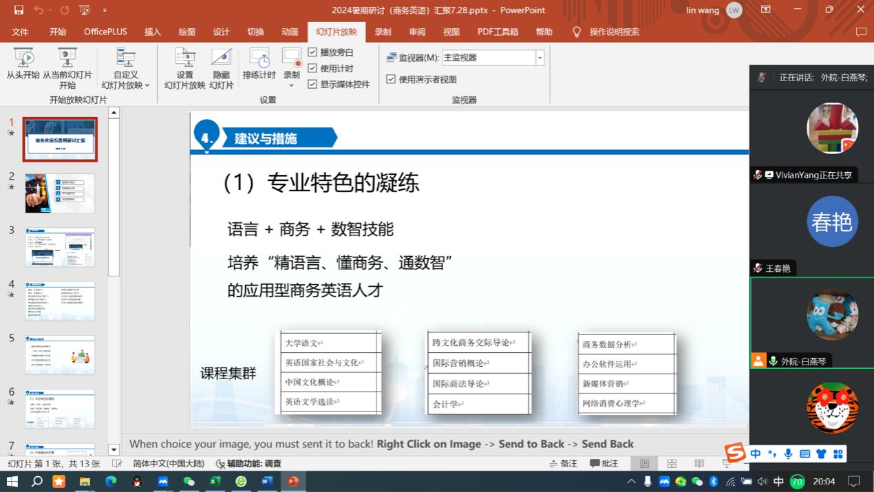 商英系王春艳主任从暑期研讨概况、前期建设成果、存在问题与不足、改进建议与措施四个方面做了汇报。王主任重点阐述了商务英语专业特色的凝练,强调“语言+商务+数智技能”,着力培养“精语言、懂商务、通数智”的应用型商务英语人才。