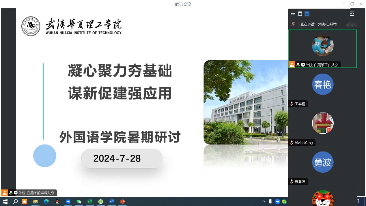 7月28日晚上19:30,外国语学院召开2024年暑期教育教学工作研讨会。会议围绕“凝心聚力夯基础 谋新促建强应用”主题展开。学院领导、科级以上干部、教授以及骨干教师参会。研讨会由副院长白燕琴主持。