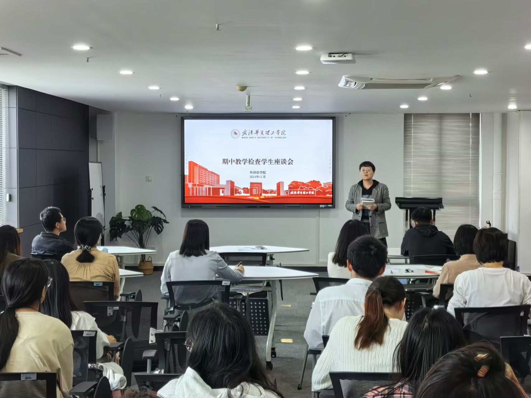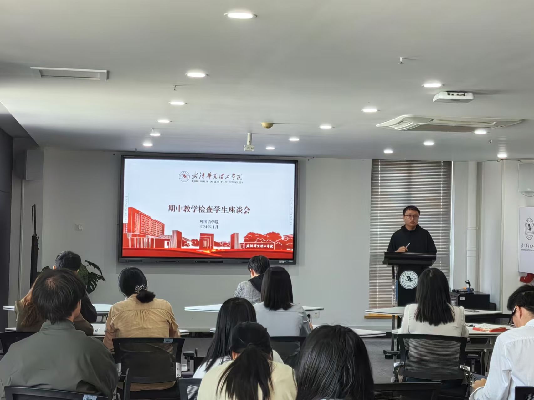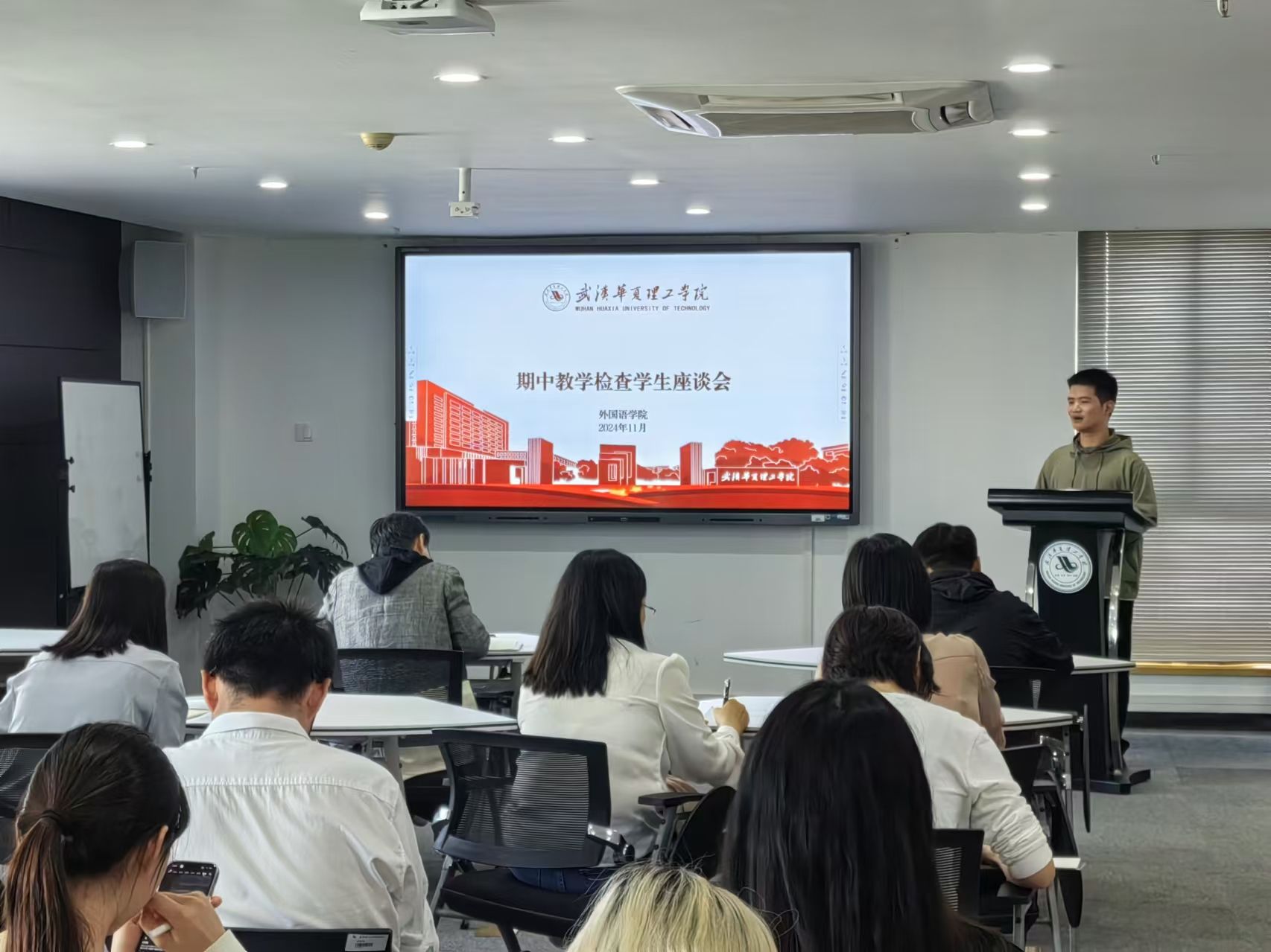 11月14日12:40,外国语学院在综合楼1401召开2024-2025学年第一学期期中教学检查学生座谈会。本次会议由学工办主任陈卓主持,参会人员有学生事务部、团委相关领导,副院长白燕琴,英语系、商英系、教学班主任,学工办主任以及各年级学生代表。