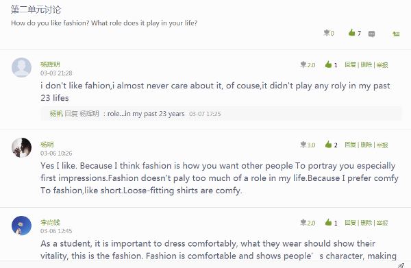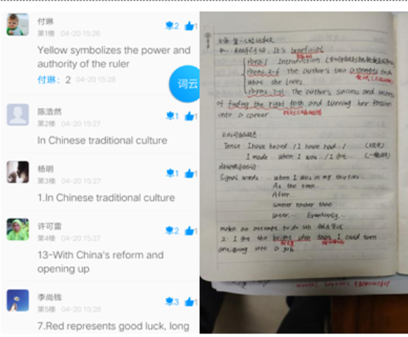 《大学英语》课程坚持“实践育人、学用一体”的教学理念,不仅提高学生的语言能力,还要培养学生的交际能力和解决问题的能力,提升思维品质和人文素养。基于这一目标定位,课程团队注重学习过程记录,综合评价课程学习成效。将过程性考核细化到课内外每一个环节,促进学习的主动性和积极性。学生上课参与性很高,无论是在线讨论、小组活动,还是课堂听写、课堂笔记,学生都积极参与并晒出作品。