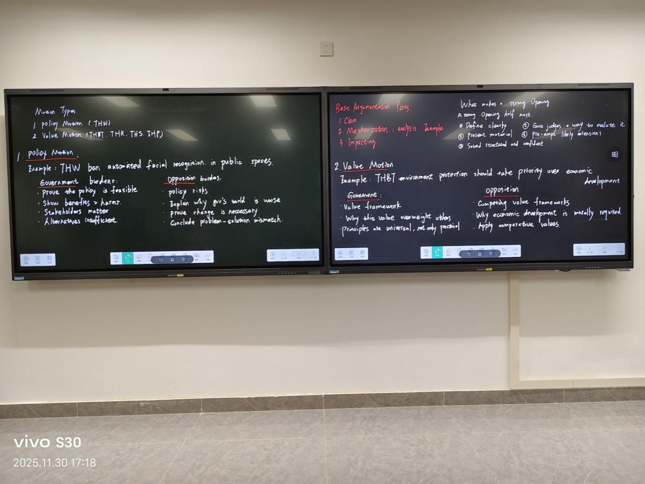 此外,实操分析选取了“THW ban automated facial recognition in public spaces(禁止公共区域使用自动面部识别)”和“THBT environmental protection should take priority over economic development(环保优先于经济)”,成员们对于两类典型辩题的特殊信号词、分析模式和评判主轴有了具体的认识,其中对“Skeleton结构”的训练让成员们的辩护更有节奏感和预判性。