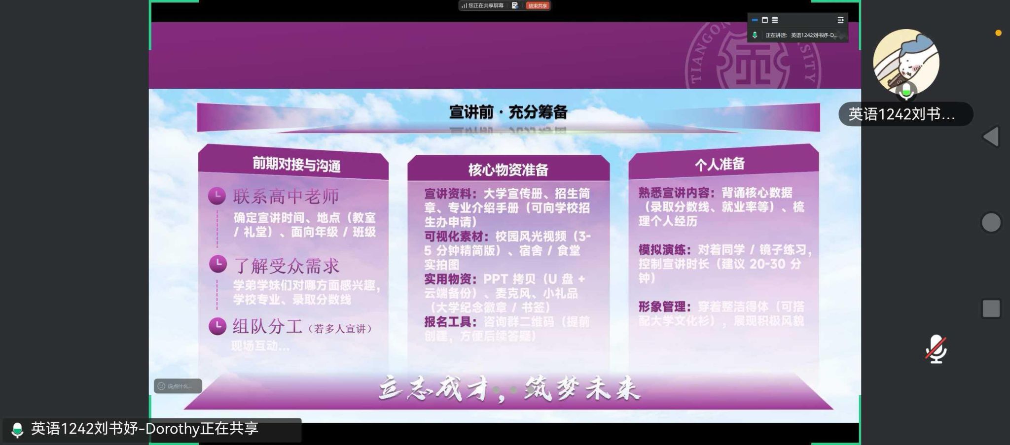 随后,刘书妤学姐为同学们带来了一场系统且细致的宣讲指南讲解。她以"干货分享,经验传递"为主题,围绕"宣讲前、宣讲中、宣讲后、解答分享"四个关键环节,详细拆解了每个阶段的准备工作、注意事项和实用技巧并且毫无保留地分享了自己的实战心得。培训内容涵盖了从前期对接、物资准备,到现场宣讲的表达技巧、互动方法,再到活动收尾与总结的全流程指南。为增强实用性,学姐还结合去年的宣讲PPT模板,分享了内容设计和制作技巧,为同学们提供了直观的参考。