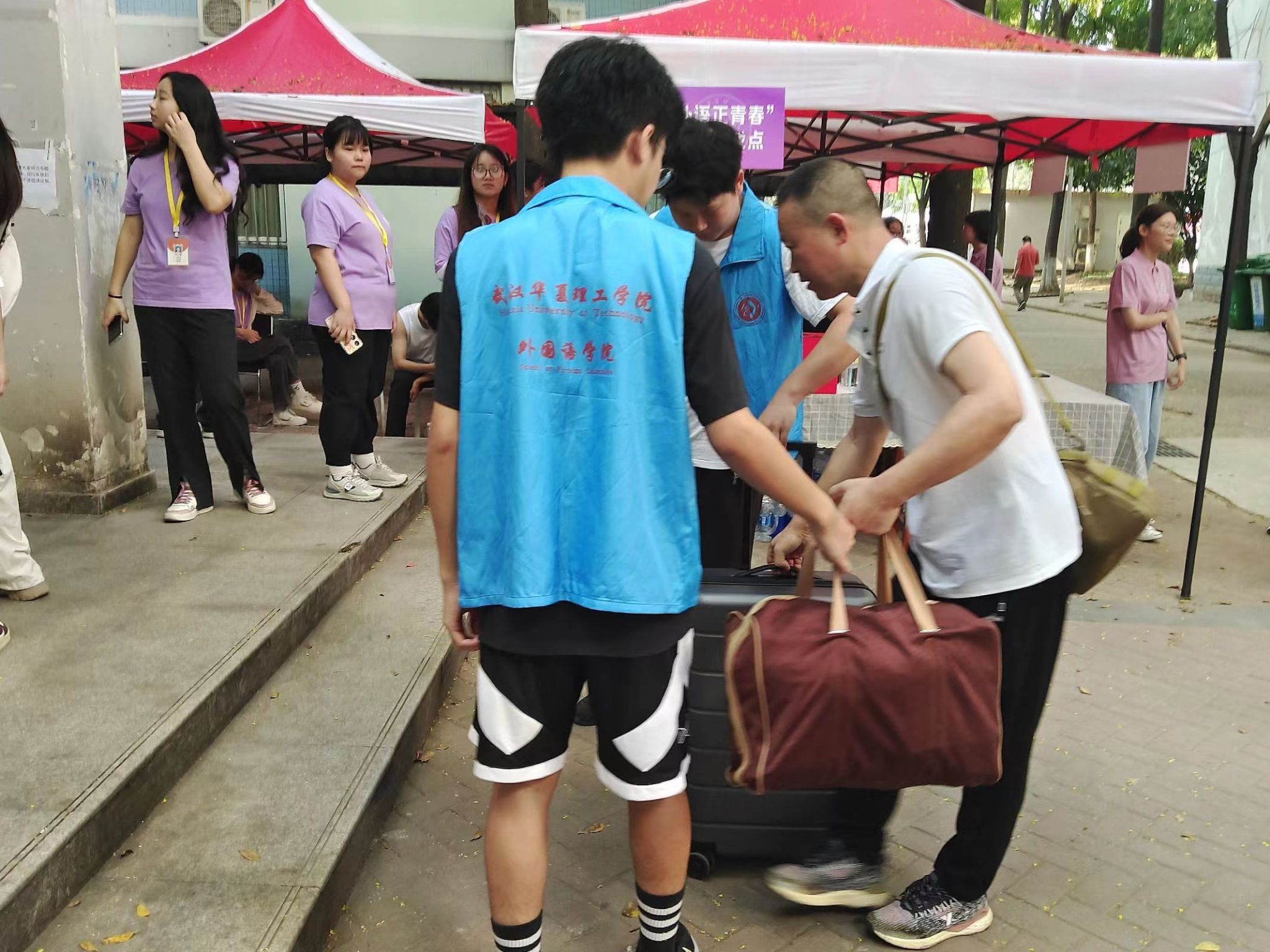在大本营现场,新生班主任依次坐在自己所带领班级的位置上,耐心地帮助23级新生排忧解难。迎新志愿者们也不停地穿梭在校园中,热情地接待每一位到来的新生,指导新生办理报道手续,帮助他们搬运行李到达寝室,带领新生熟悉校园环境。