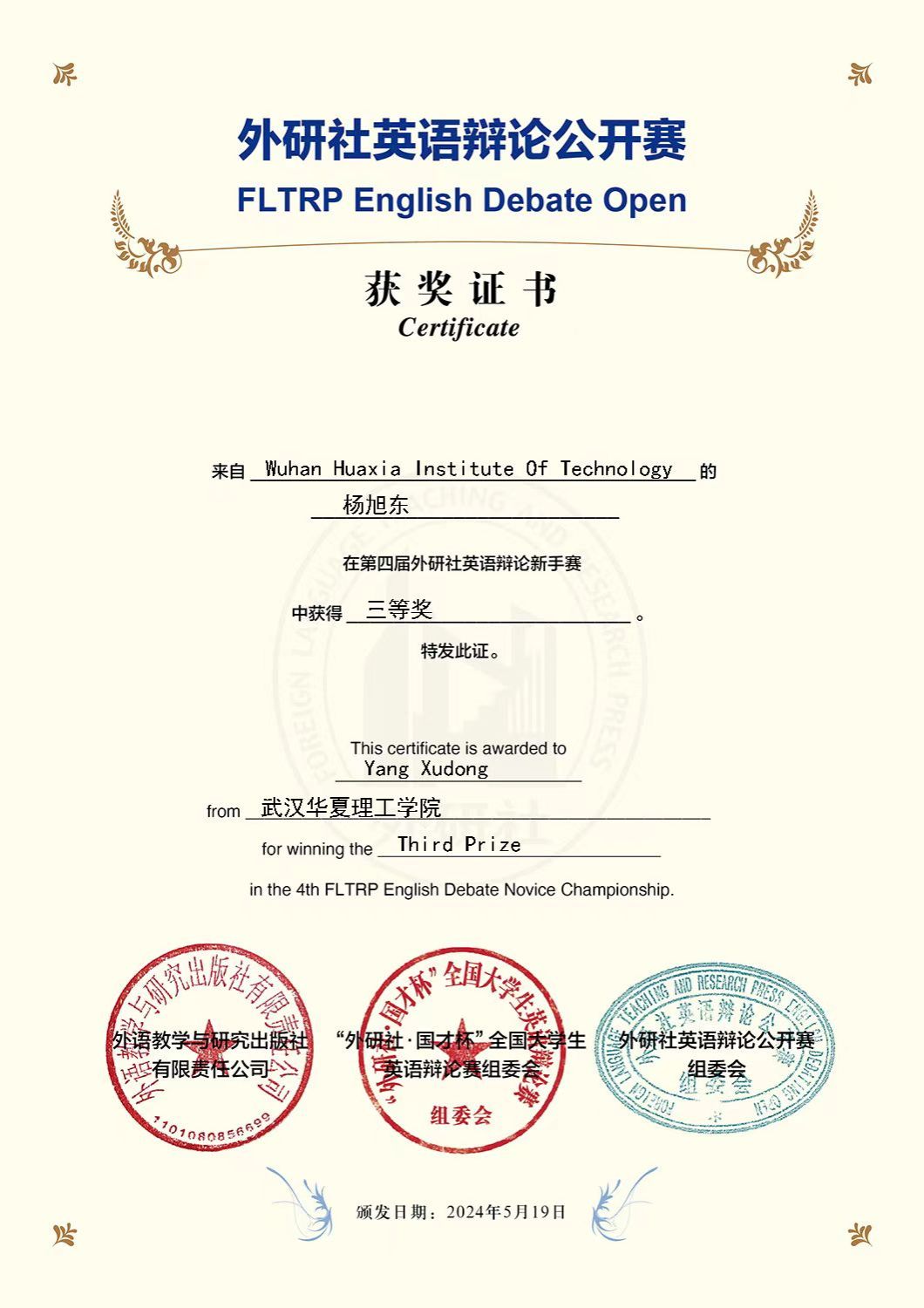 近日,第四届外研社英语辩论新手赛获奖证书下发了。外国语学院商务英语专业21级学生杨旭东和英语专业23级学生周玉洋在第四届外研社英语辩论新手赛中荣获三等奖。