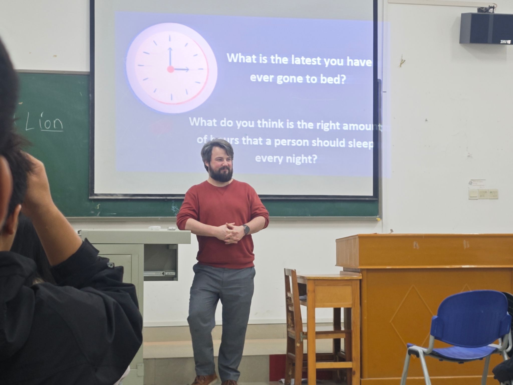 活动开始外教首先进行了简单的自我介绍与规定阐述,然后以一些简单的问题开启话题。同学们就这些问题分享了日常生活中助眠的方法、晚上最晚睡觉的时间与自认为必需的睡眠时长。同学们积极参与,创意性地提出了很多想法,一些同学通过听白噪音等音乐助眠,有的同学通过喝牛奶、洗热水澡来助眠。人体所需的睡眠时长并非固定,针对不同人的不同时期或许都有差异,我们身体需要休息多久就依此制定合理的睡眠时间。