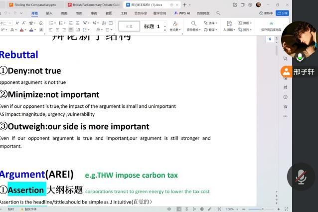 在备赛方法上,重点强调“寻找比较项(Finding the Comparative)”,纠正“先盲目头脑风暴己方论点”的误区,指导社员在备赛初期明确正反方核心差异,通过“善意解读对方立场”和“魔鬼辩护(Play the devil’s card)”提前预判攻防,提升辩论严谨性。