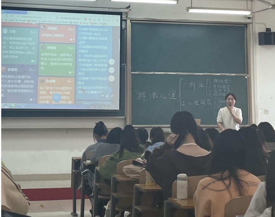 本次公开课的主题为教育心理学之群体心理。课前彭姚老师提前让参与课堂实验的助手做好配合准备。开场时,彭老师以四种常见的集体图片为引,让学生判断哪些可以是群体。接着彭老师细致地讲解了群体的概念,并且用学习通选择题任务的形式学习了群体的特点,然后大家再次判断四组中哪些是群体。经过概念的学习,学生的正确率有了极大的提升。之后老师引入群体心理效应的概念,通过两个课堂试验让学生们深刻的体会到了群体的心理效应之从众与服从,并且引入案例,让学生将学习理论与实践相结合。最后,彭老师引出思考问题从众与服从的区别。