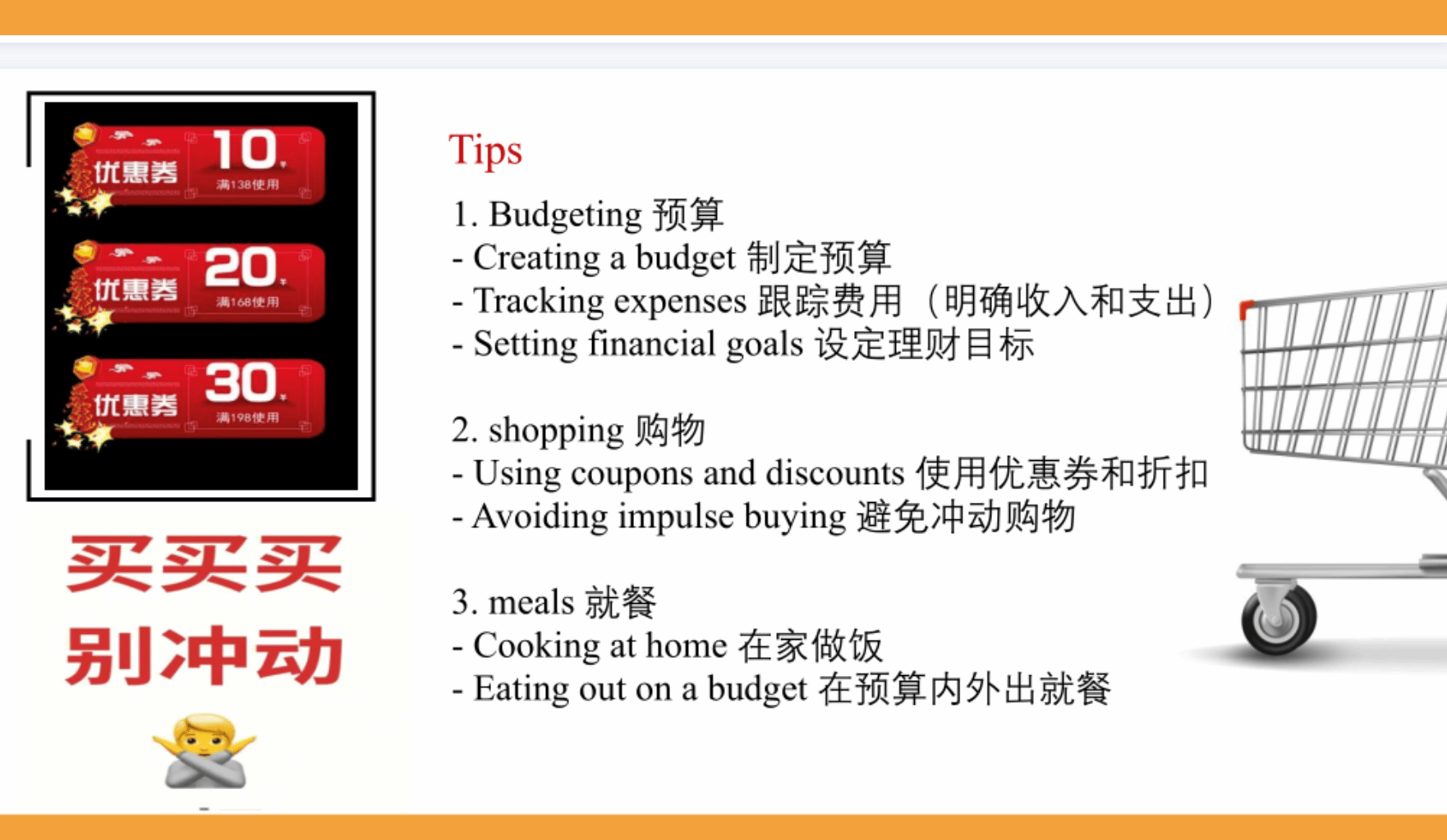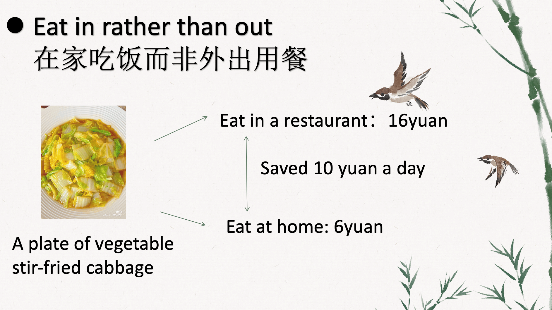 思政目标是建立学生勤俭节约的思维方式。为了实现能力目标和思政目标,除了通过课文讲解和案例分析与讨论等活动外,课程教师还组织了以“节约小妙招”为主题的展示活动。