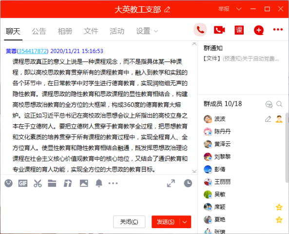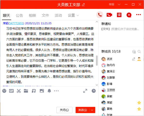 为深入学习贯彻习近平总书记重要文章《思政课是落实立德树人根本任务的关键课程》的精神,进一步推进学校思政课建设,11月25日,外语学院大英教工支部召开学习《思政课是落实立德树人根本任务的关键课程》专题会。支部全体教师参加会议,会议由支部书记曹勇波主持。