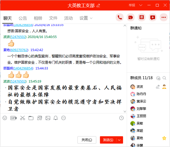今年4月15日是第五个全民国家安全教育日。国家安全与每个人息息相关,维护国家安全是每个公民应尽的义务。为进一步增强支部教师的国家安全意识,切实筑牢国家安全人民防线,大英教工支部组织党员教师通过直播或重播收看中央电视台“社会与法”频道(CCTV12)《生命线》栏目播出的专题片《汇聚人民力量 维护国家安全》。