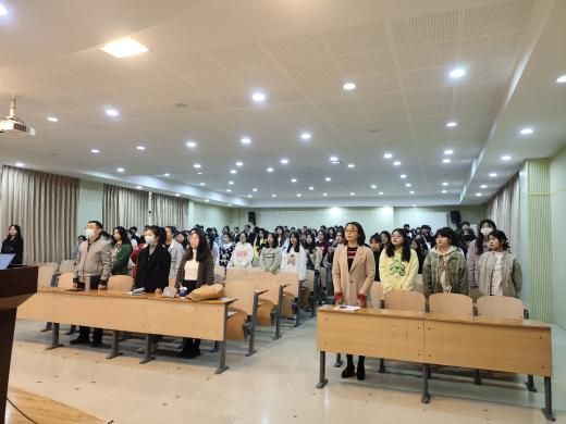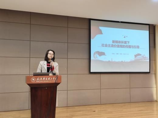会议第一项,全体起立,齐唱国歌。接着,张慧老师以习近平总书记同青年大学生座谈时强调的观点引出“中国社会主流价值观”的定义——社会主流价值观是指在一个社会的价值观念体系中占据主流、起着引领作用的价值观。随着张慧老师的深刻解读,帮助在场学生正确区分中国传统价值观与社会主义核心价值观。引申出新媒体环境下,社会主流价值观传播的重要性,介绍了新媒体技术传播的优越性。她指出,希望同学们可以善用新媒体,传播正能量。随后,张慧老师向在场学生分析了当前面临的新形势和新环境,列举多个真实事例展现多元文化对社会主流价值观的冲击、新媒体对社会主流价值观的冲击。并通过这些负面影响验证了“新媒体是把双刃剑”观点,要想改变“西方国家抹黑中国”的政治常态,需改变价值多元化对峙甚至冲突的格局。构建传播主流价值观,掌握价值观念领域主动权、主导权、话语权,是我们必须解决好的重大课题。由此,张慧老师接着向大家阐述社会主流价值观传播现状——中国声音通过主流媒体、社会大众媒介、自媒体来传播。并通过人民日报一系列典型案例证实主流媒体在其中发挥重要作用,同时也列举了“东方甄选”等社会媒介对社会主流价值观的多元表达,也展现出自媒体从各自不同的角度表达观点和传播价值观的良好风貌。