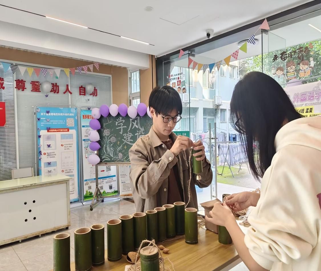 本次活动由学院精心筹备,提前为参与学生配齐风铃骨架、彩绳、贝壳、小铜铃、麻绳等各类创作材料,长桌整齐排布、截制规整的青竹筒有序码放,为学生们提供充足的创作空间。活动鼓励学生自由组建团队,分工协作、各展所长。部分同学积极发挥创意,聚焦细节装饰的制作与呈现,将贝壳、铃铛等特色元素进行有序串联与巧妙搭配,共同完成作品创作,让每一件作品都融入独特的创意与心意。部分同学们埋首摆弄着材料,专注手工环节,沉浸投入,全神贯注完成创作,展现出积极参与、认真投入的良好风貌。