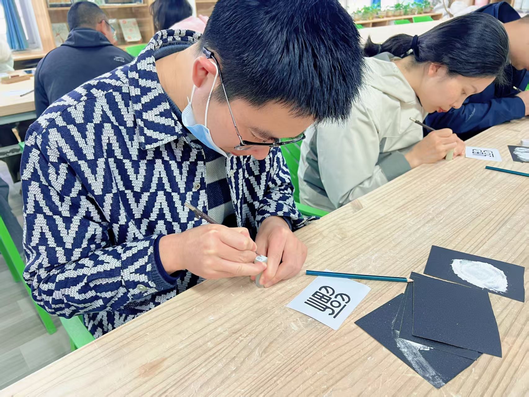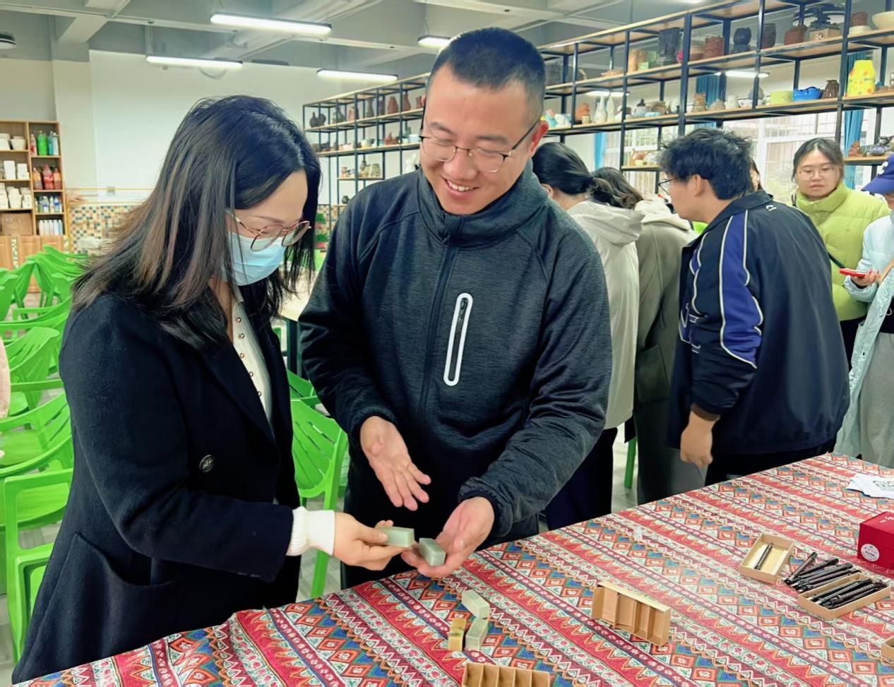 随后开展的手工实践环节将活动推向高潮。特邀嘉宾焦洁老师带领全体辅导员进行印章雕刻体验。在她的指导下,辅导员们以石为纸、以刀为笔,将职业感悟与艺术创意融入方寸之间。有的镌刻育人箴言,有的呈现地标、吉祥物等创意图案。一枚枚独具匠心的印章,既展现了辅导员队伍的审美素养,更凝聚着他们对育人工作的深刻理解。活动现场欢声笑语不断,平日忙碌的辅导员们在沉浸式创作中放松身心、增进交流,石屑纷飞间传递着思政工作者的教育情怀。