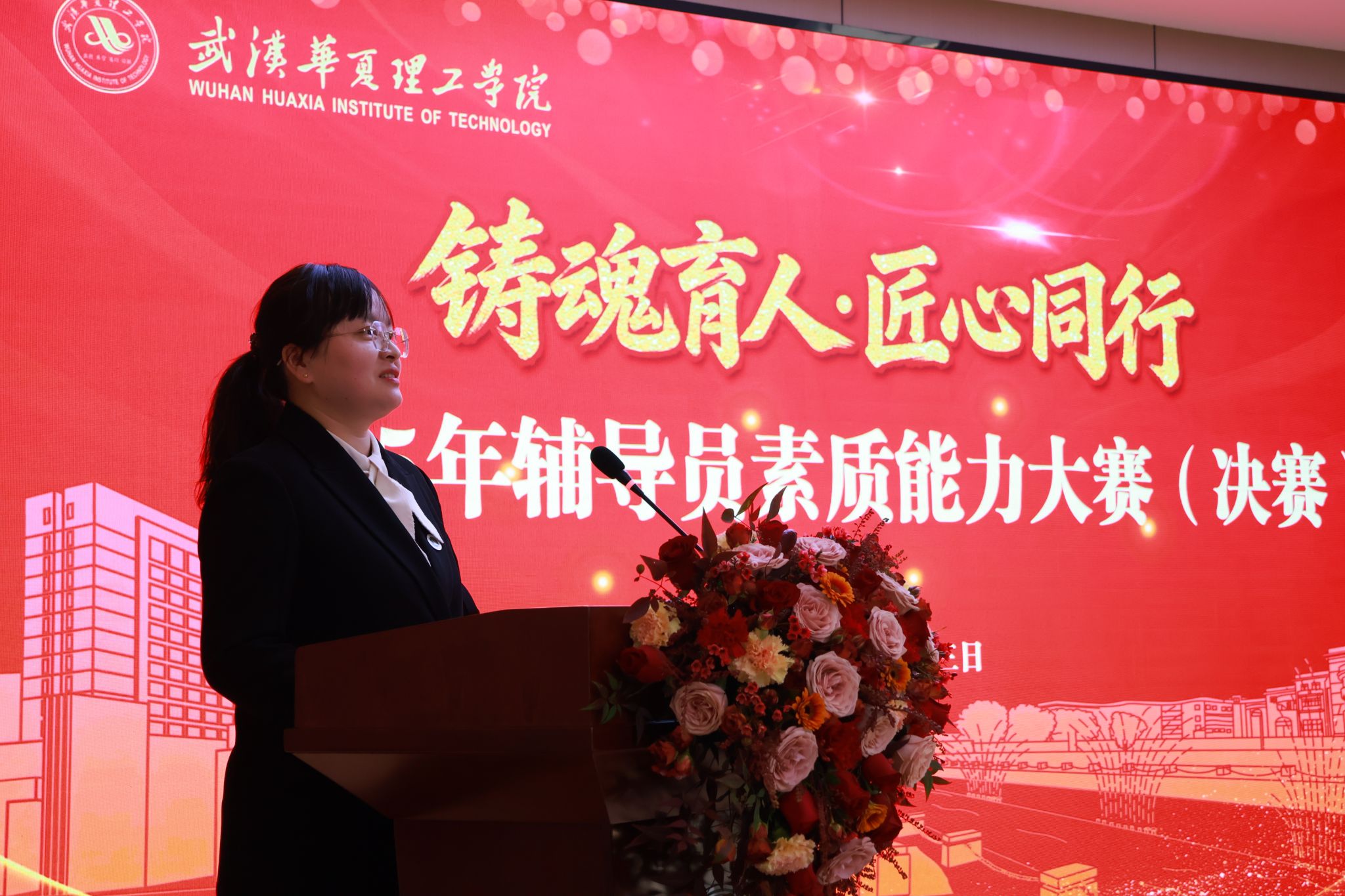 为深入学习贯彻党的二十届四中全会精神和2026年全国教育工作会议部署,全面落实立德树人根本任务,持续推进辅导员队伍专业化、职业化建设,1月13日下午,武汉华夏理工学院“铸魂育人·匠心同行”2025年辅导员素质能力大赛决赛在多功能报告厅隆重举行。学校党委副书记、副校长李海民,党委组织部部长淡玉堂,党政办公室主任李凯,党委学生工作部部长陈伟,马克思主义学院副院长王东出席活动并共同担任评委。大赛还特别邀请武汉工商学院党委学生工作部部长陈义文、湖北大学知行学院党委学生工作部部长王刚担任外部评委,为选手提供专业指导。各学院党总支副书记、全体辅导员及相关部门人员100余人现场观摩,梧桐湖校区同步组织师生通过线上直播全程观看,实现两校区联动共享育人盛宴。本次大赛由党委学生工作部副部长潘晶主持。