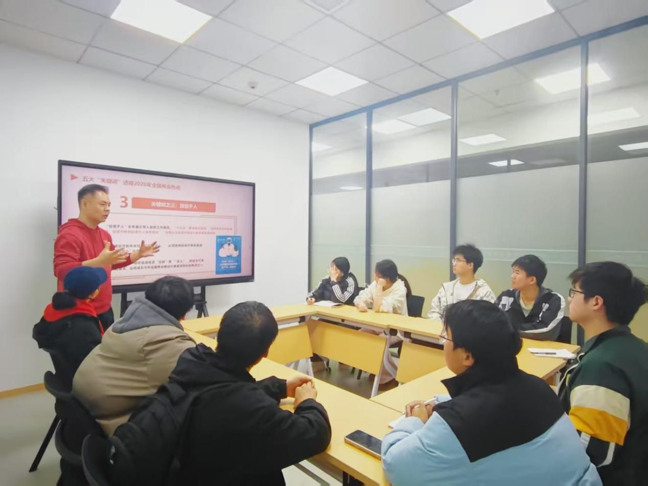 活动期间,学工部充分发挥统筹引领作用,组织部门教师深入学生社团开展主题讲座,围绕2026年全国两会概况、“十五五”开局、积极有为宏观政策、“投资于人”、智能经济等五大关键词,结合政府工作报告中的新词要点进行专题解读,引导学生社团骨干先学一步、学深一层。讲座现场互动热烈,社团成员纷纷表示要将学习成果转化为服务同学、服务校园的实际行动,切实发挥示范带头作用,带动更多学生关注国家发展、思考时代命题。