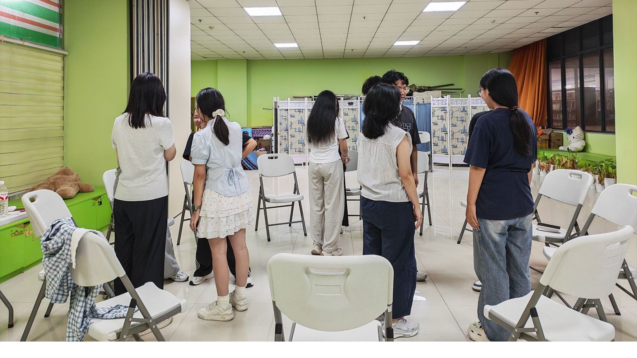 首次活动围绕“感受”展开。暑假后的初次相聚,成员间还略带生疏。在钟沁玥老师的带领下,“手指接触喊名”游戏打破了沉默。随后的“呼吸同频”环节,大家在轻柔音乐中闭目调息,从专注自身到感知彼此,逐步实现呼吸同步,建立起初步的心灵联结。“萝卜蹲”和“镜像舞蹈”进一步活跃了氛围,成员们在欢笑与协作中增进了对彼此的了解,为后续团队合作打下了基础。