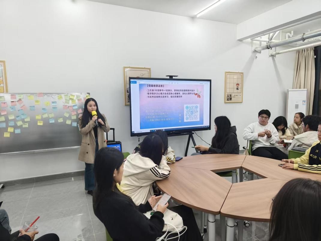 紧接着,中心专职教师钟沁玥登台,为同学们描绘了在心理健康教育中心实践与成长的另一番图景。钟老师详细介绍了学生助理的工作内容与收获,并现场向全体心理委员发出诚挚邀请,欢迎大家积极报名,来到心理中心担任咨询助理。她指出,这一角色不仅能让学生更深入地了解心理健康工作的运作,还能在实践服务中提升个人综合能力,是实现自我成长与服务他人的绝佳平台。