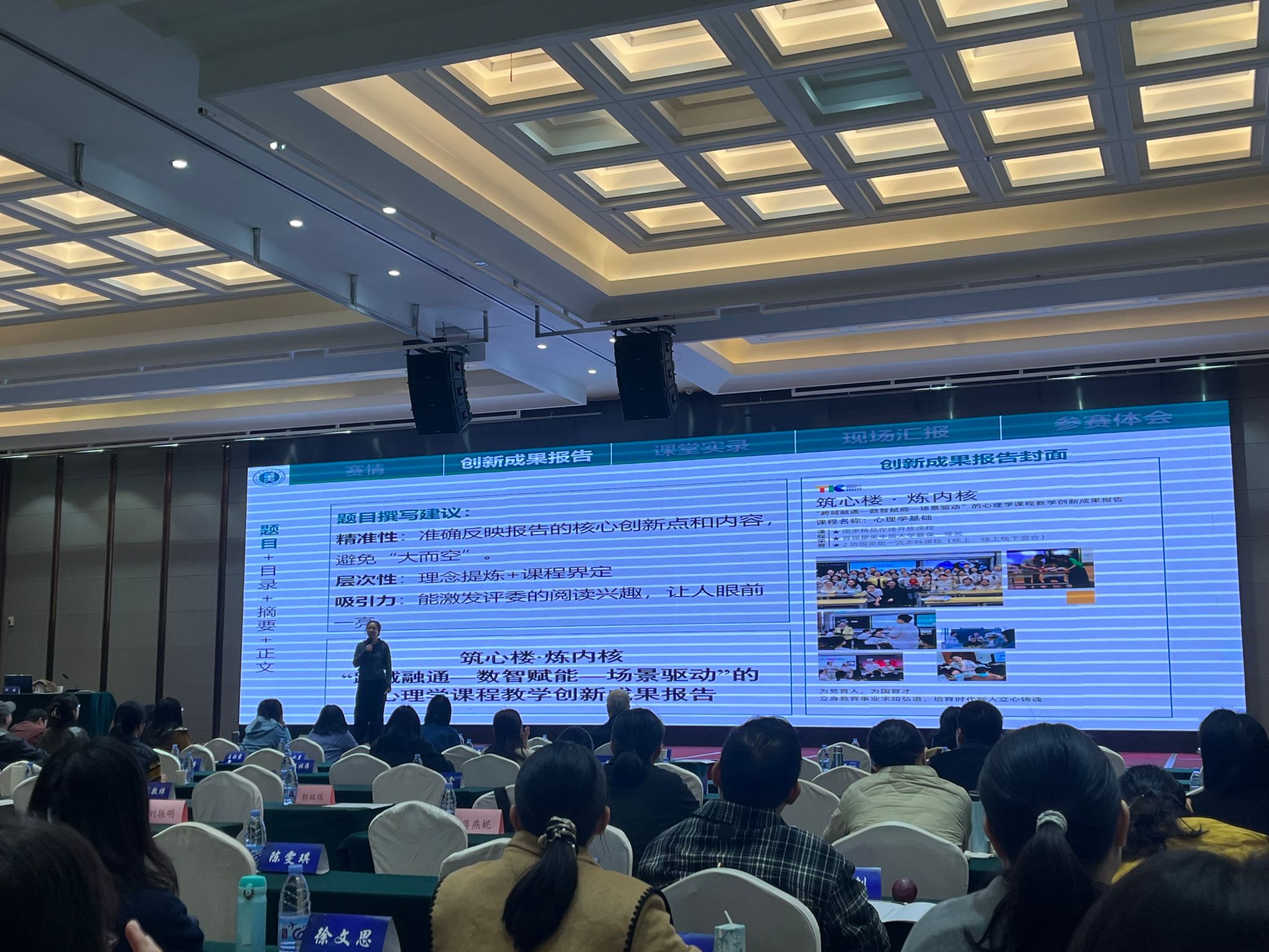 华中师范大学田媛教授以《心理学基础》为案例,作了新文科赛道评审规则与备赛经验分享,主题是“我的备赛笔记——从课堂到赛场的全过程梳理”。田教授获国赛一等奖的创新成果报告题目“筑心楼·炼内核:‘跨域融通-数字赋能-场景驱动’的心理学课程教学创新成果报告”别具特色。培训会上,田教授分别从创新成果封面个性化设计、目录标题如何避免千篇一律、摘要内容比例分配、正文写作的内在逻辑、课堂录课的设计、现场汇报技巧等方面,全方位解读了她参加教学创新大赛的心路历程。