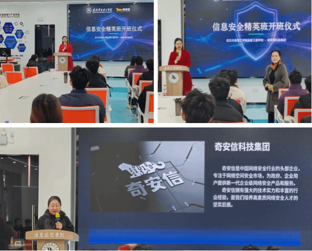 为深化产教融合,精准培育高素质网络安全实战型人才,助力网络安全行业高质量发展,3月9日上午,武汉华夏理工学院华为-华夏人工智能现代产业学院联合奇安信科技集团,于光谷校区信息工程楼412实验室,隆重举行信息安全精英班开班仪式。校企双方领导、授课教师代表及精英班全体学生齐聚一堂,共同见证这一重要时刻,开启校企协同培育网安人才的新篇章。
