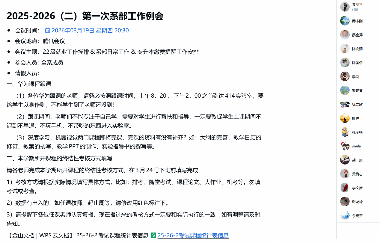 针对开学面临的华为校企合作课程教师跟课、毕业生就业情况落实、自动化专业专升本招生等事项,人工智能与自动化系于2026年3月19日在腾讯会议召开工作例会进行反馈、讨论与安排,会议由人工智能与自动化系主任袁丽平主持。