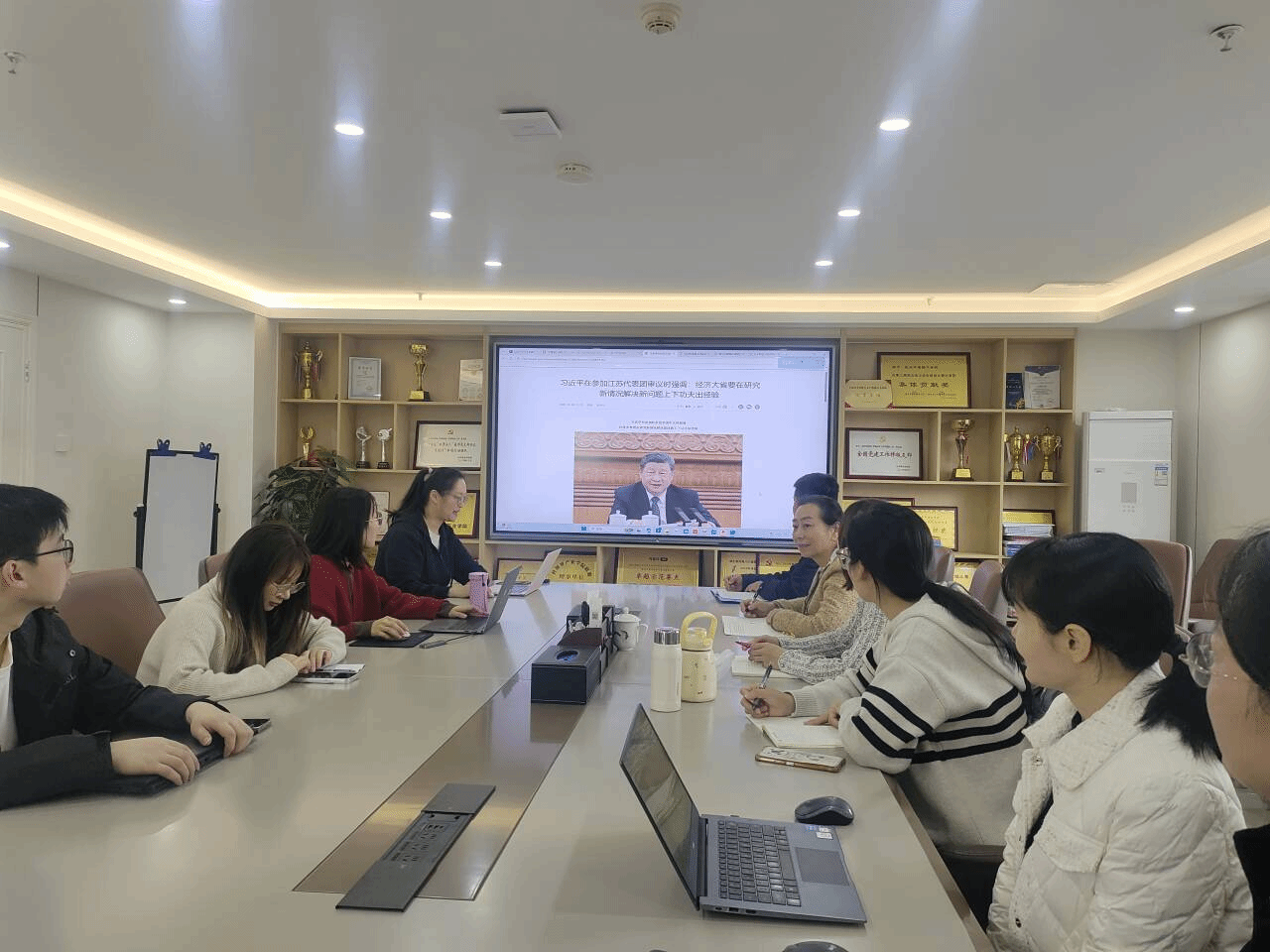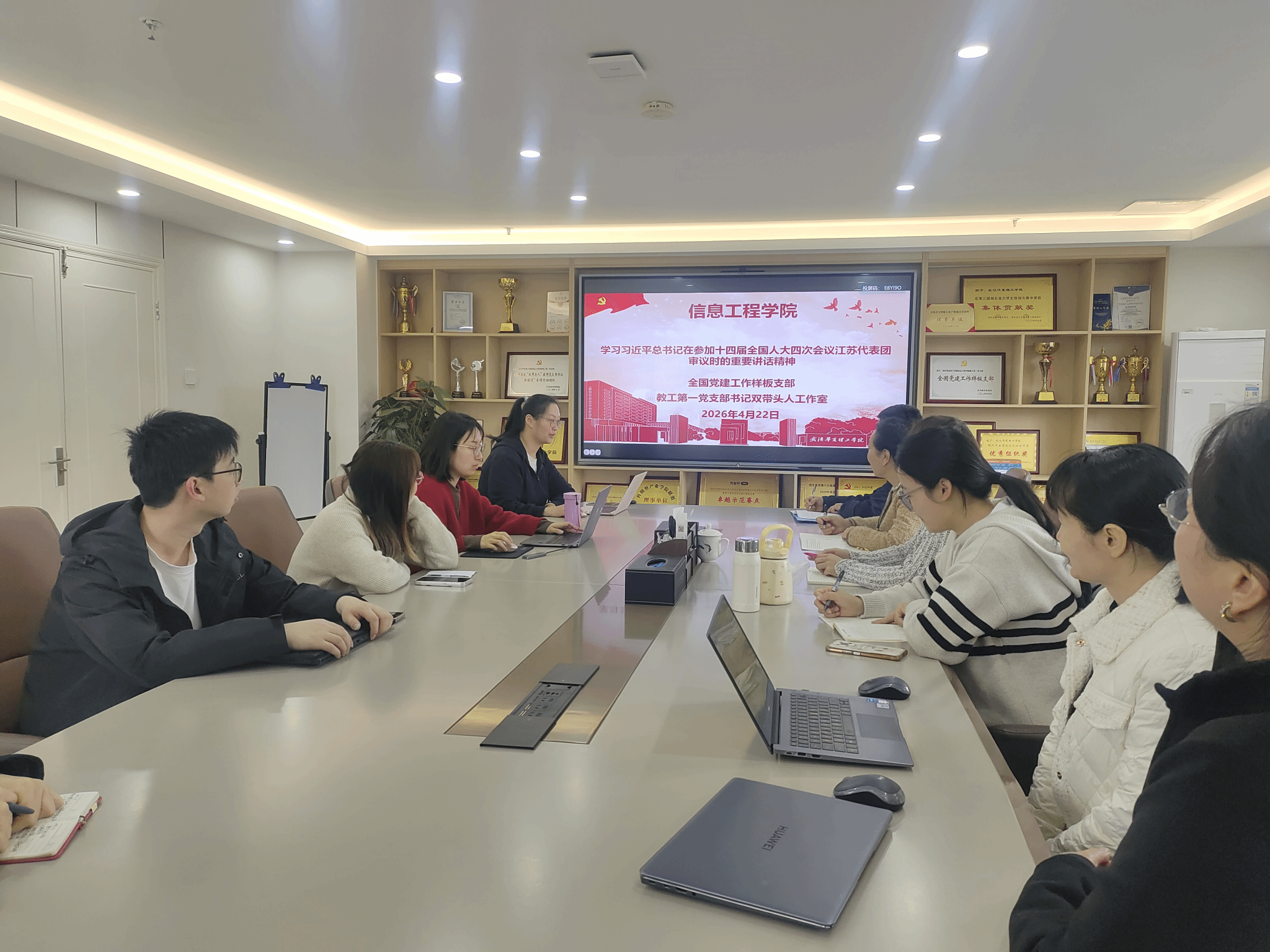 2026年4月22日下午,教工第一党支部在702会议室召开四月份理论学习会议,集中传达学习习近平总书记在参加十四届全国人大四次会议江苏代表团审议时的重要讲话精神。会议由支部书记袁丽平主持,支部全体党员教师参加了此次学习。