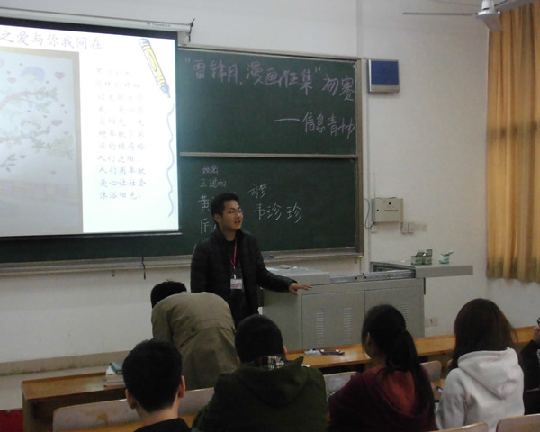 2014年3月25日中午十二点半,在3-102,由信息系青协举办的漫画征集初赛正式开展,本次活动的评委由青协副会长王声光及青协各部门的部长担任。本次漫画征集活动目的主要是传承雷锋奉献精神,此次活动也让我们看到了选手们真情的流露。