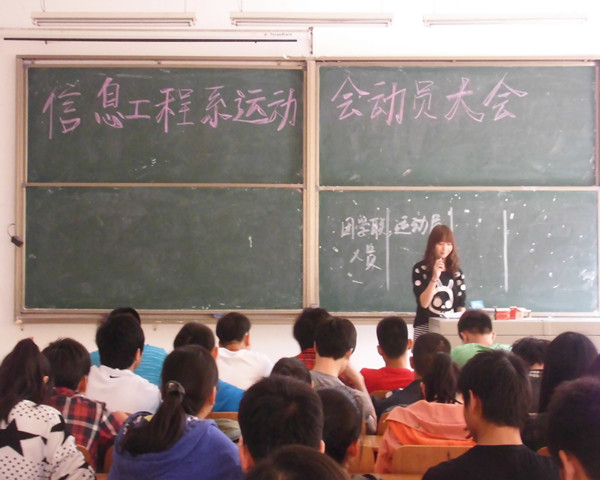 4月10日中午12点,信息工程系运动会动员大会在一教107教室顺利召开。系学工办主任刘继平、团学联指导老师向胜涛、团学联全体成员以及全系运动员参加了会议。