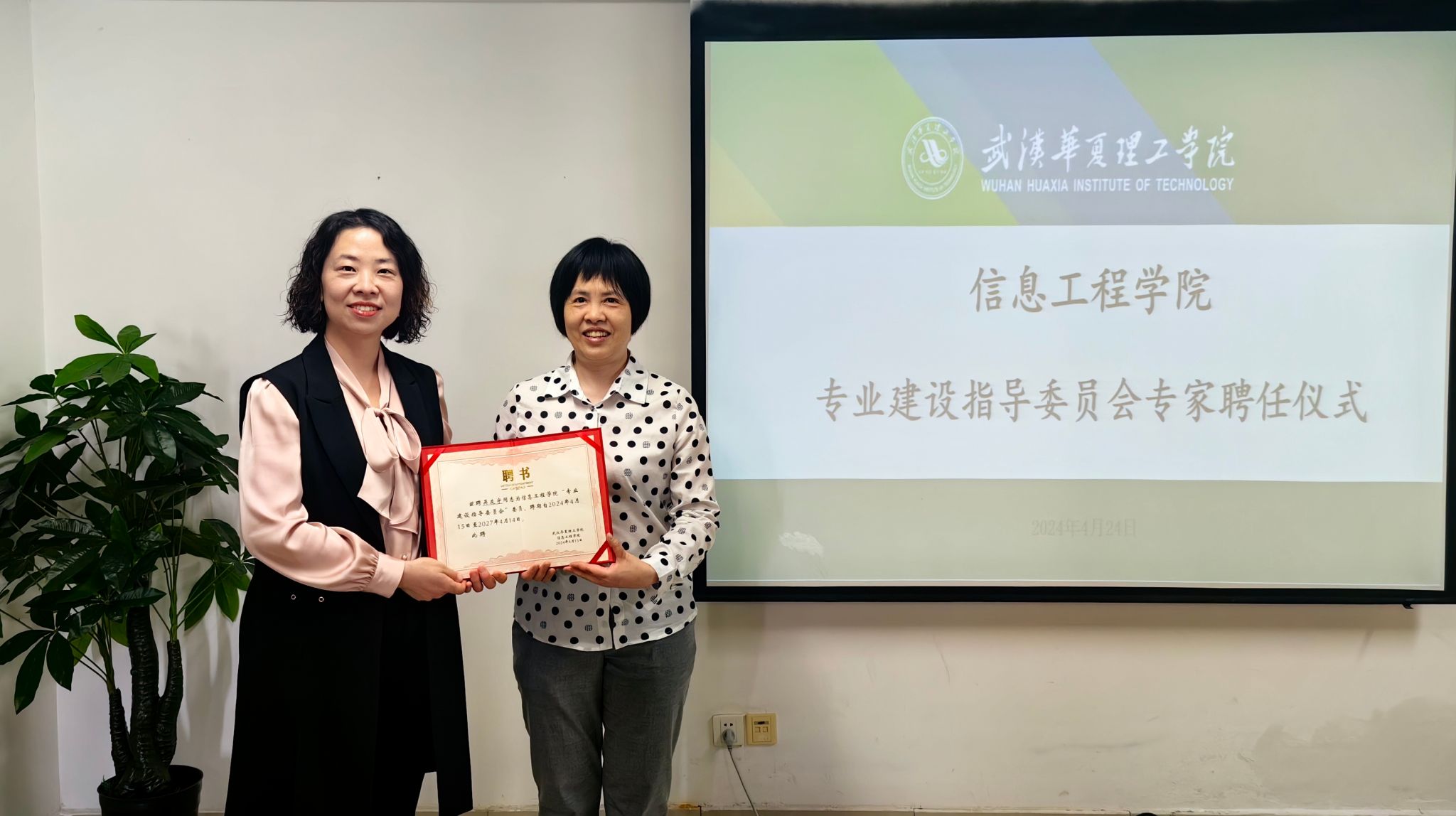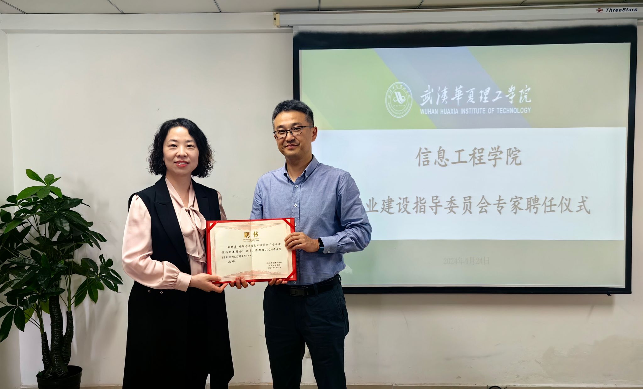 2024年4月24日下午2:30,信息工程学院在702会议室举行了专业建设指导委员会校外专家聘任仪式。出席本次聘任仪式的有学院执行院长夏婷、副院长赵京、两名校外专家及学院各专业负责人。