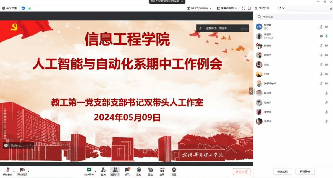 为落实学校期中教学检查工作要求,加强教学质量监控和过程管理,信息工程学院人工智能与自动化系于2024年5月10日下午4点召开期中工作例会,会议采用腾讯会议线上方式。会议由系主任袁丽平老师主持,系部全体教师参会。本次会议涵盖了诸多重要议题,包括评选三育人先进个人和师德标兵、教师师资培训、督导辑要解读通报、毕业设计期中教学检测反馈、校企合作课程开发、课程评估上报、教科研项目申报等内容。