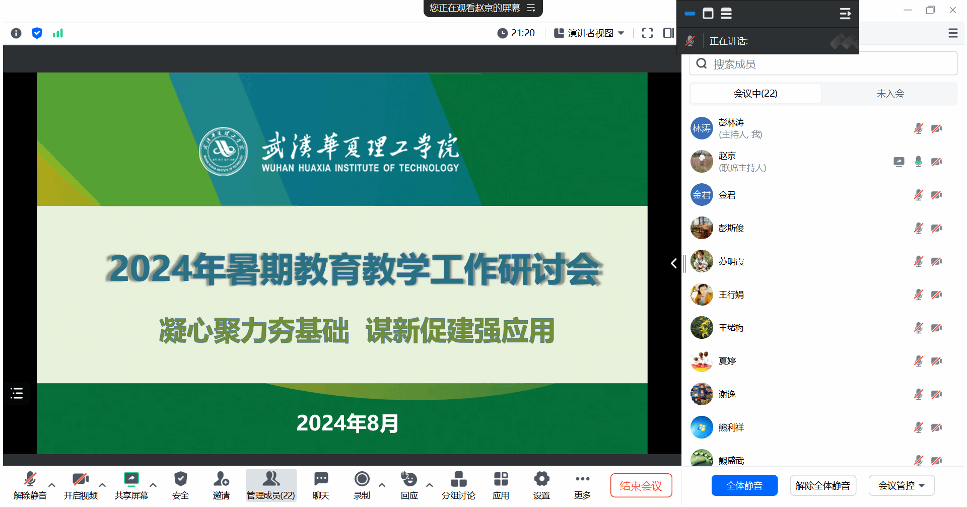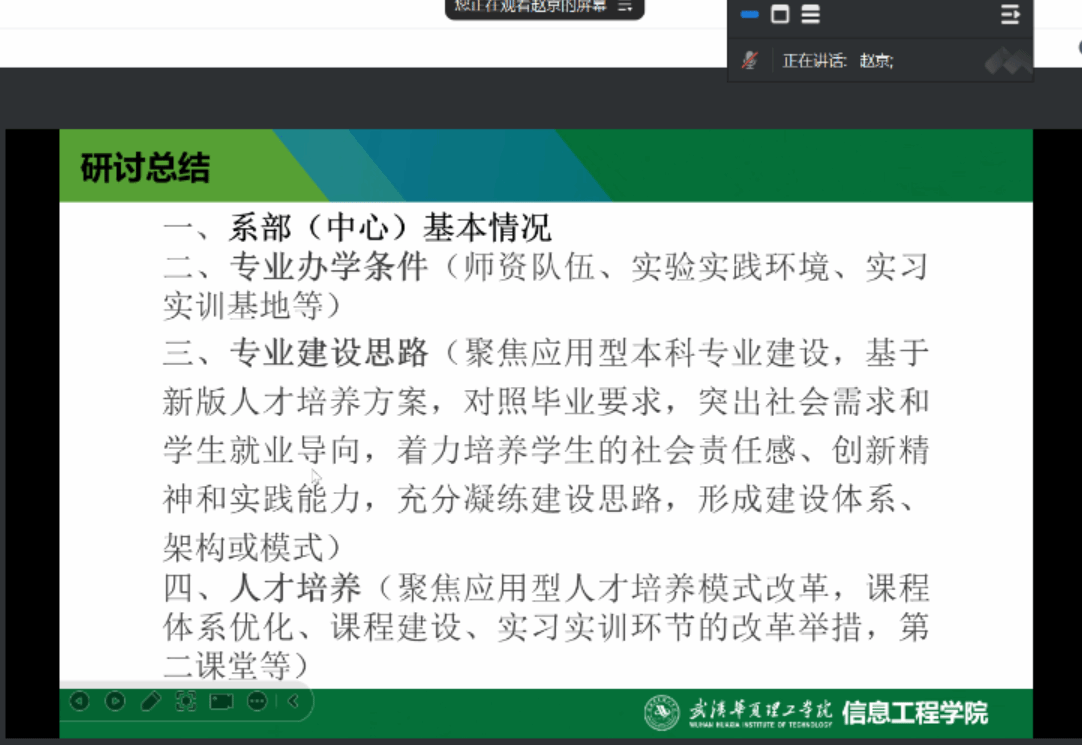 2024年8月2日,信息工程学院通过腾讯会议召开了“凝心聚力夯基础,谋新促建强应用”为主题的教育教学研讨会,本次研讨是在前期研讨基础上进行的一次总结汇报研讨。学院执行院长夏婷、党总支书记张平、副院长王绪梅、赵京、全院教授、各系部主任及副主任参加了会议,会议由副院长赵京主持。