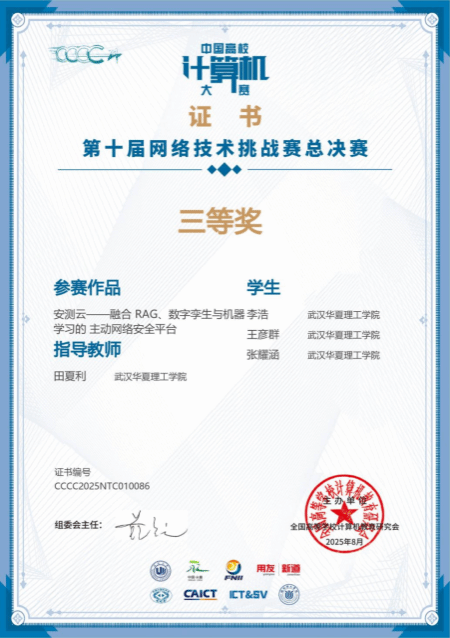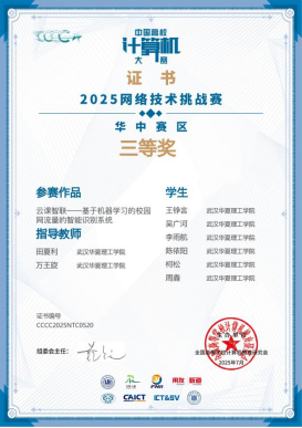 近日,2025中国高校计算机大赛——网络技术挑战赛全国总决赛圆满落幕。在这场汇聚全国顶尖高校的网络技术竞技盛会上,武汉华夏理工学院派出的五支学生参赛团队,展开了智慧与创意的巅峰对决,尽显IT学子的卓越风采与创新锐气,以“全晋级、多突破”的亮眼表现交出了一份高质量答卷:五支队伍全部通过资格赛,斩获华中区选拔赛一等奖1项、三等奖1项。