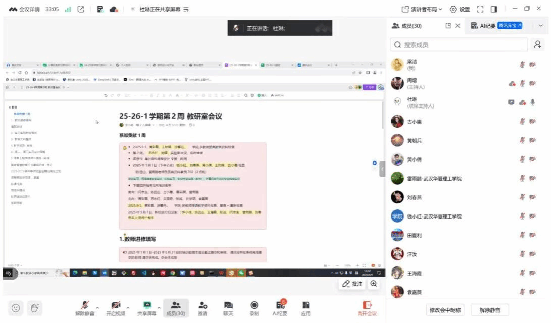 此外,教研室负责人还对教师发展与学生管理相关工作进行统筹安排。教师发展层面,推进教研室课件模版优化工作,为教学资料标准化奠定基础;同步落实教育部2025年暑期教师研修任务,助力教师持续提升专业能力。学生管理层面,已公示2025-2026学年导师班主任聘任名单,鼓励导师班主任结合学生班级课表,在授课过程中加强与学生的沟通交流,精准关注学生成长动态;同时明确2025-2026学年第一学期听课任务要求,每位教师需完成至少4次听课并及时上传记录,通过互听互学促进教学水平共同提升。