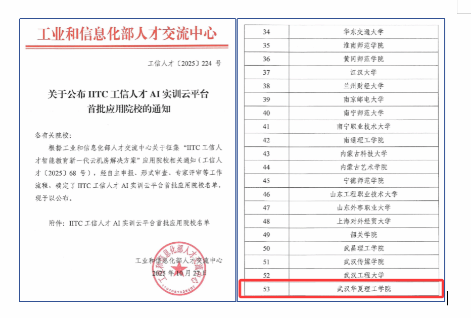 近日,工业和信息化部人才交流中心正式公布了《IITC工信人才AI实训云平台首批应用院校名单》。经过多轮严格评审,武汉华夏理工学院成功入选,成为全国首批应用该国家级平台的本科院校之一。本次申报工作由我校信息工程学院牵头主导,并最终成功获批,彰显了学院在人工智能与信息技术领域的积淀与前瞻布局。
