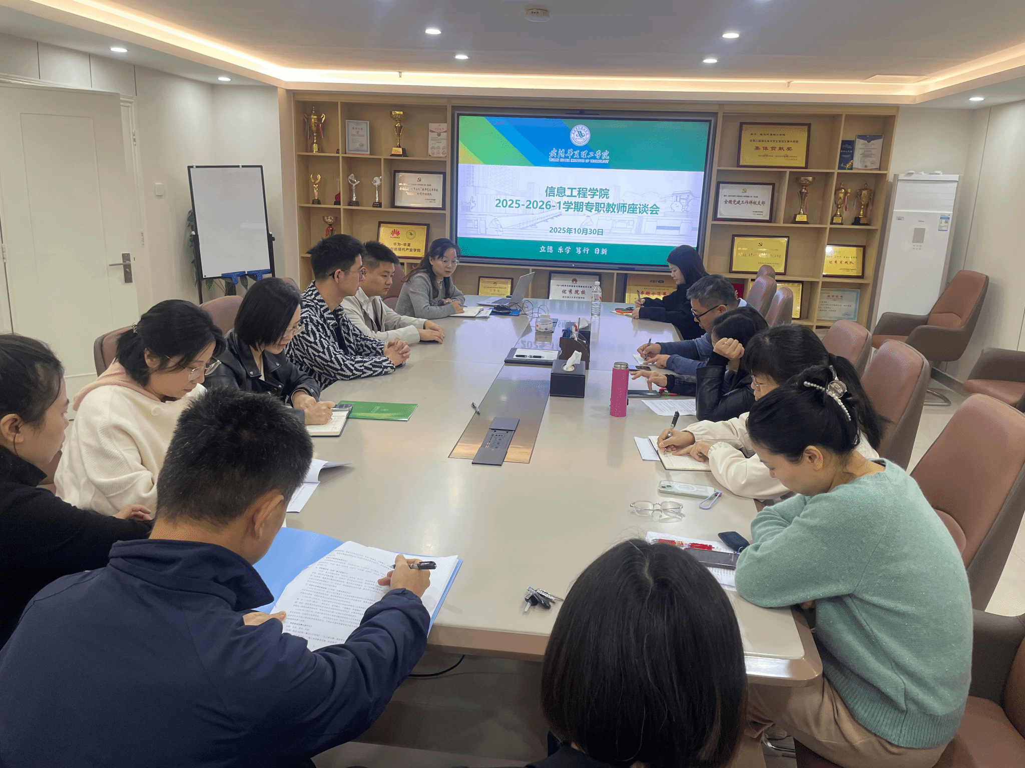 为进一步加强教风学风建设,提升课堂教学管理水平,促进教师之间的经验交流与共同成长,信息工程学院于10月30日上午10:30在综合楼702会议室召开了2025-2026-1学期专职教师座谈会。会议由赵京副院长主持,学院各系部专职教师代表及科研部张城芳部长参加了此次会议。