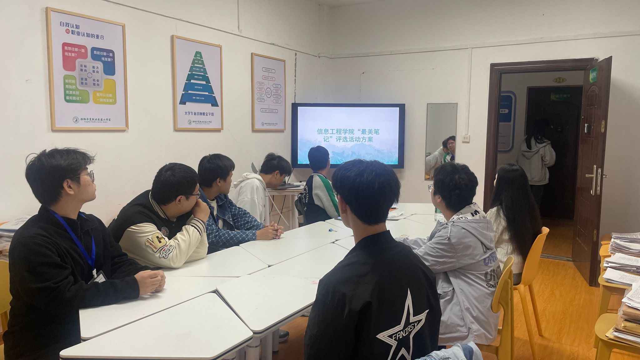 为挖掘学院学子优秀学习成果,以优秀笔记为载体传递高效学习方法,进一步浓厚全院优良学风,2025年10月31日,信息工程学院秘书部在创新创业基地202,组织召开“最美笔记”评选活动方案讨论会,部门全体成员参会,共同为活动推进定方向、划细节。