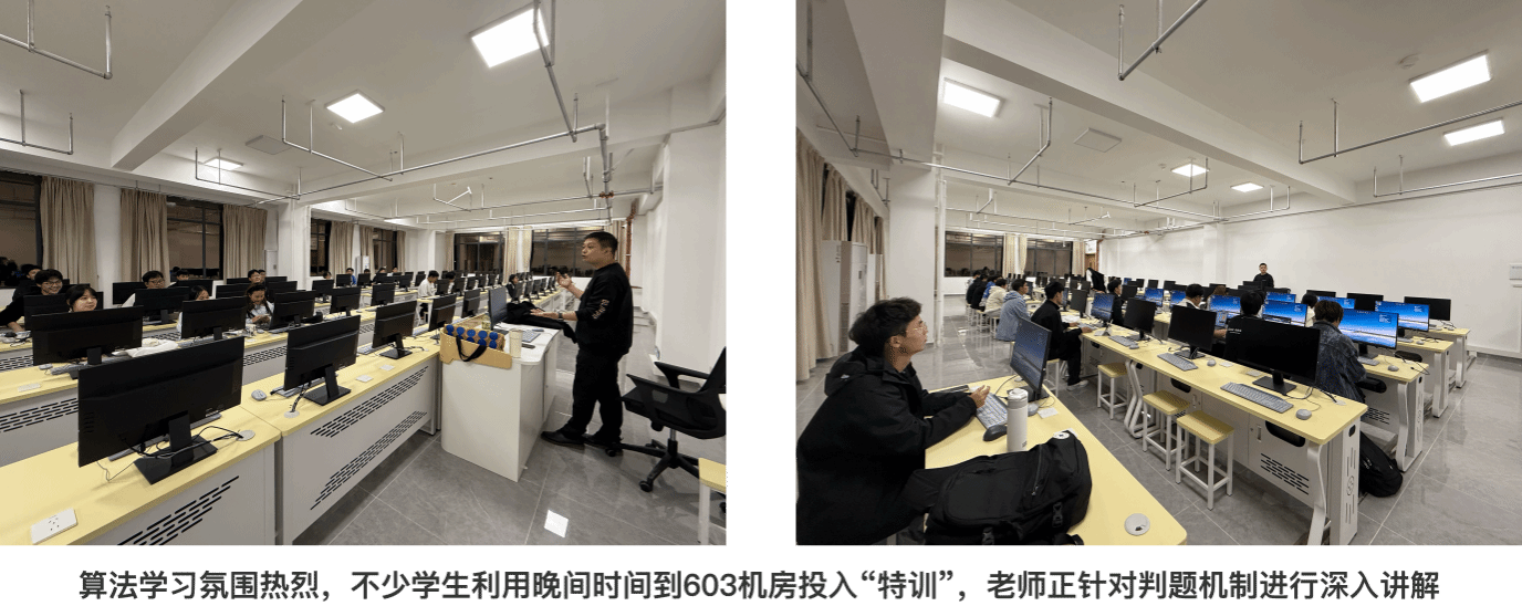 除了提供专业的练习场地,学院更注重为参赛学子提供优质的教学指导。在学生晚自习时段,指导老师围绕 “学习方法”“训练路径”“工具应用” 三个核心维度开展系统性辅导:在学习方法上,结合竞赛题型特点,指导学生掌握高效的代码编写思路、问题分析技巧与错题复盘方法,帮助学生形成科学的学习习惯;在训练路径上,根据学生基础差异制定分层训练计划,从基础算法巩固到进阶数据结构突破,再到竞赛真题模拟,逐步提升学生的解题能力与竞赛适应力;在工具应用上,详细讲解编程工具的操作技巧、调试方法及竞赛常用辅助工具的使用,助力学生提升编程效率,减少因工具使用不当导致的失误。