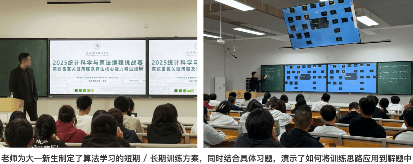 为切实提升学生编程实践能力,助力学子在《2025 统计科学与算法编程挑战赛》中斩获佳绩,信息工程学院积极统筹资源,由算法协会与智慧教育产学研名师工作室共同推进赛事筹备工作。鉴于梧桐湖校区大一新生报名热情高涨,计算机、软件工程、大数据、自动化皆有学生报名参赛(报名+有报名意向学生87名),学院特申请将实训楼 603机房作为专项竞赛练习场地(每日参加培训学生约合20多人),并依托该场地在学生晚自习时段开展系统性算法编程辅导,主要由周熠、谭采薇老师讲解算法比赛注意事项及解题技巧,为参赛学子搭建起专业、高效的备赛平台。
