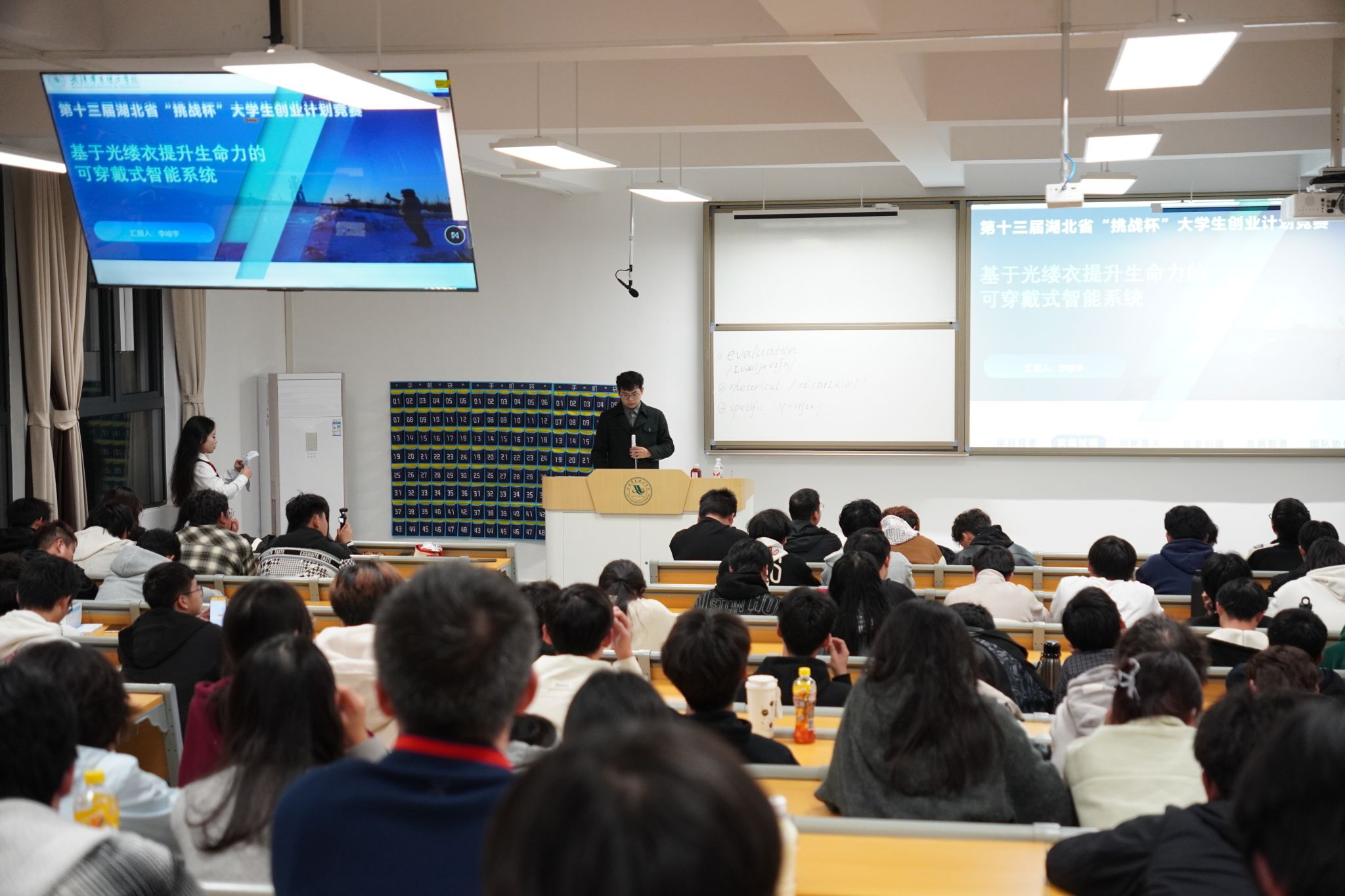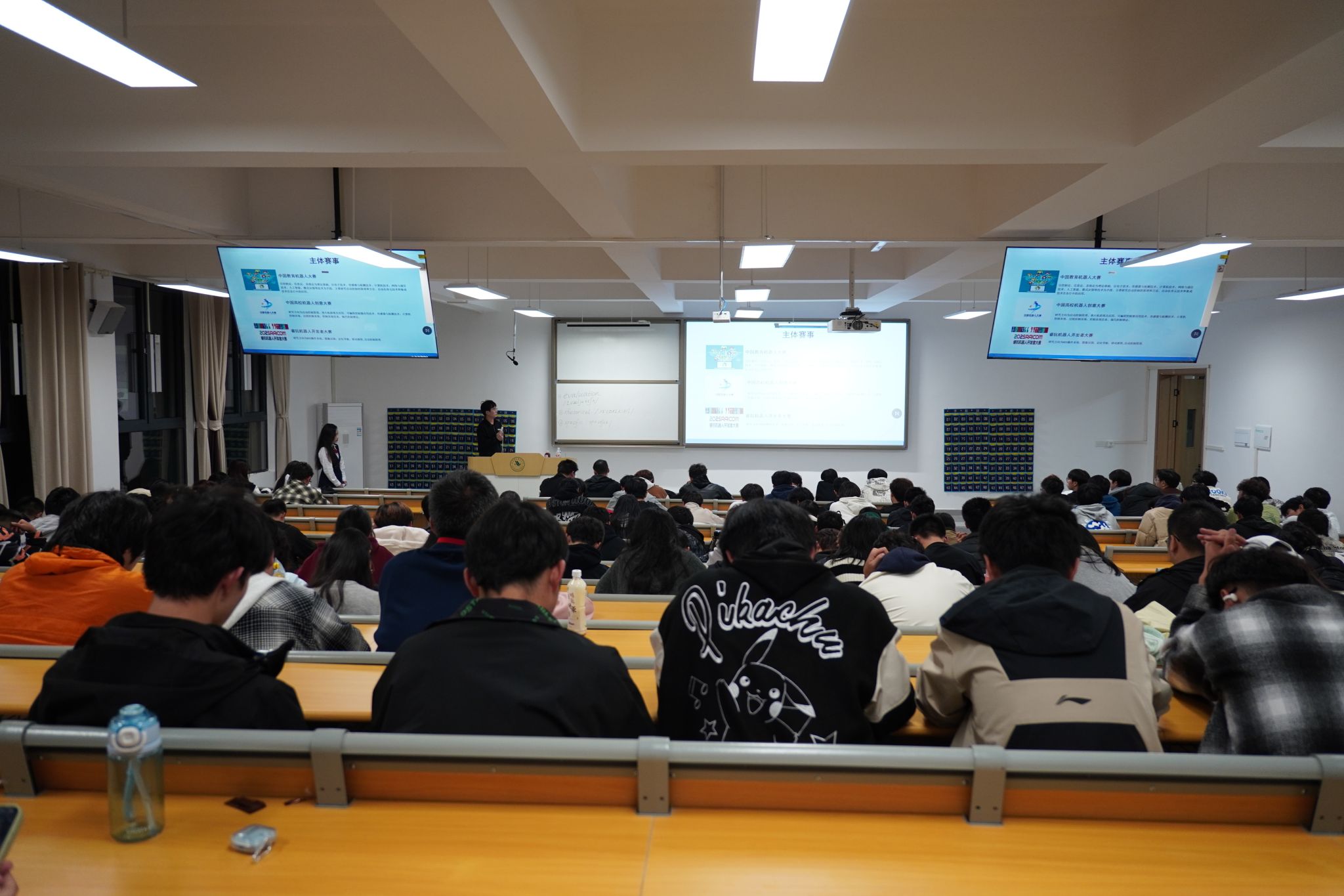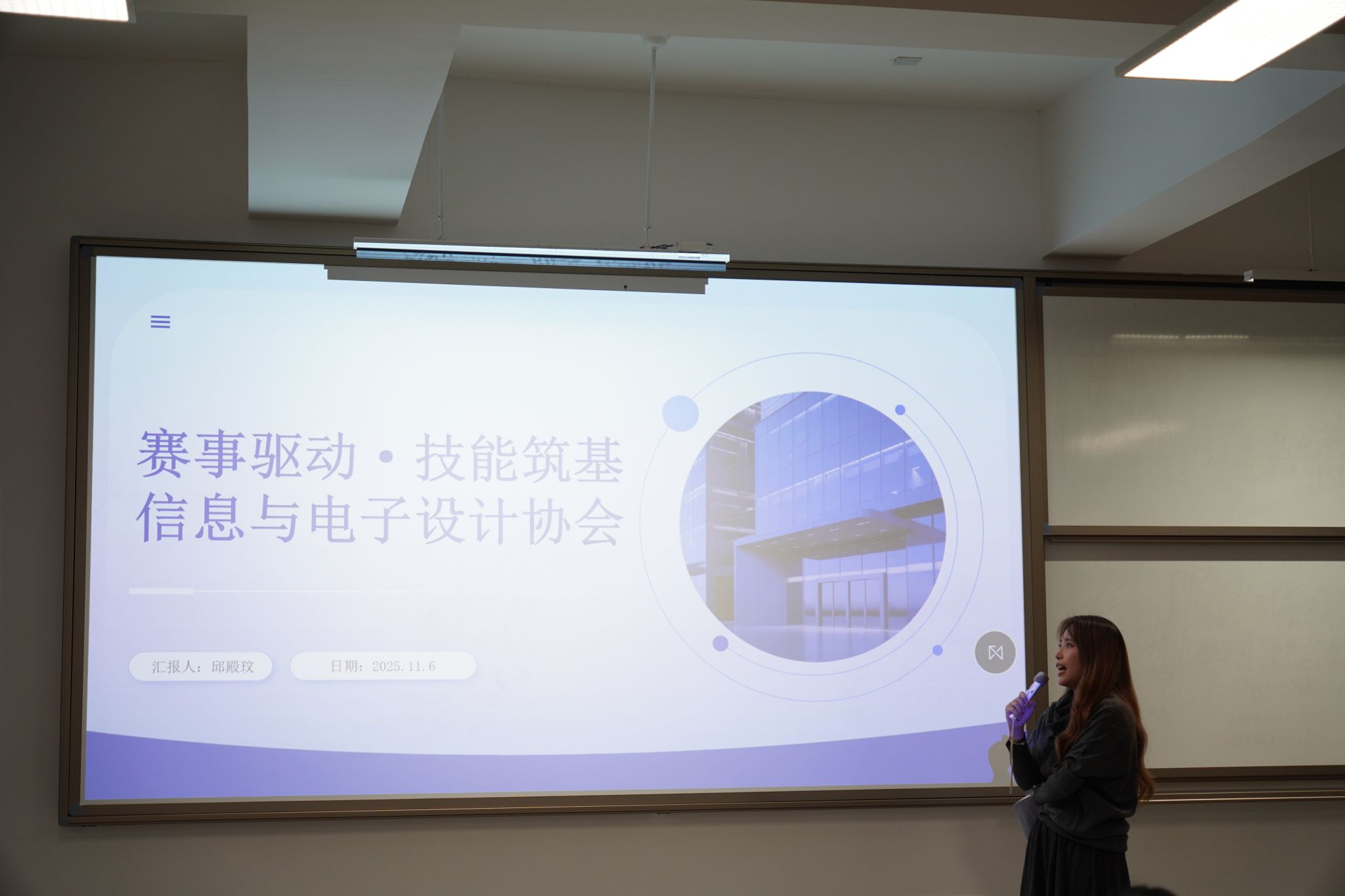 在核心分享环节,六大协会的优秀代表依次登台,结合自身科创经历传经送宝。人工智能与机器人协会的胡坤明分享了参与睿抗机器人开发者大赛的备赛历程,他带领团队攻克ROS操作系统应用、图像识别等技术难题,最终斩获全国总决赛两项二等奖,其展示的团队协作搭建临时赛场的经历,让新生深刻体会到科创路上的坚守与担当。 大数据协会方佳垚围绕“数聚青春 智创未来”主题,介绍了协会“理论学习-技能实训-赛事实战-社会服务”的培养体系,分享了在华为ICT竞赛、全国大数据分析技术技能大赛中的获奖经验,展现了数据技术在乡村振兴、民生服务中的应用价值。信息与电子设计协会邱殿玟聚焦全国大学生电子设计竞赛和RoboMaster机甲大师赛,详解了从基础焊接、嵌入式编程到机器人搭建的成长路径,其团队在机甲大师高校联盟赛中斩获的一等奖荣誉,激发了新生对电子科创的浓厚兴趣。创新创业协会李峻宇带来“戍边新胄——基于光缕衣的可穿戴智能系统”等获奖项目分享,从项目调研、技术创新到市场转化,完整呈现了创业项目孵化全过程,其作品斩获湖北省“挑战杯”铜奖、中国国际大学生创新大赛省级银奖的成绩,传递了“敢想敢闯、务实创新”的创业理念。算法协会王甜甜、数理应用与建模协会何升权则分别从竞赛备赛策略、团队协作技巧、核心技能提升等方面分享经验,为新生提供了可落地的科创入门指南。活动现场还设置了协会互动咨询环节,六大协会通过展示特色成果、解答新生疑问,吸引了众多新生驻足交流。各协会的招新群二维码在屏幕滚动展示,方便新生后续深入了解。