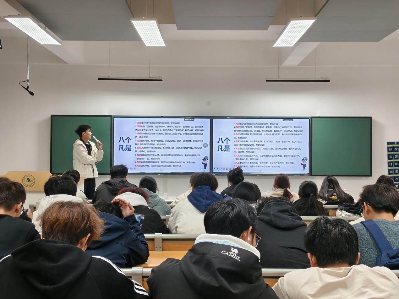 活动伊始,班会以“我校真实电诈情景分析”为切入点,结合“游戏道具买卖诈骗”“虚假购物类诈骗”等校园真实案例展开探讨与讲解。同时结合《治安管理处罚法》相关条款,明确招嫖行为的违法性及法律后果。针对“刷单返利类诈骗”这一类骗局,团支书剖析了其“低门槛、高回报”的诱骗逻辑,点明其目标人群多为“缺少社会经验、无固定收入却存侥幸心理的学生群体”,并通过近期案例让同学们直观认识“小利引诱、大额套牢”的诈骗套路。