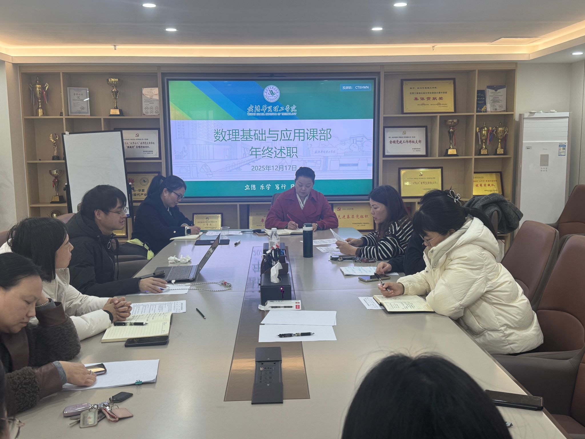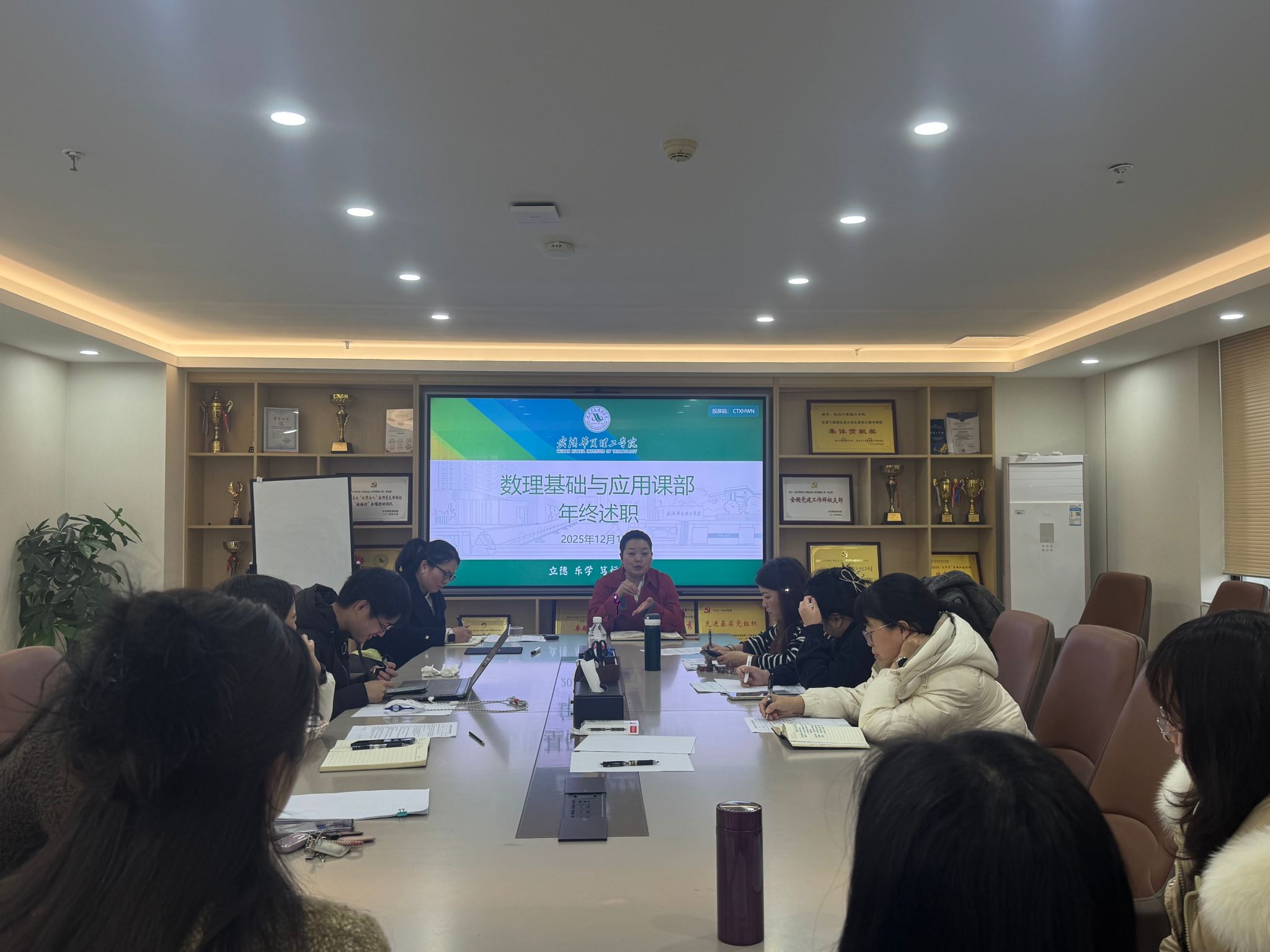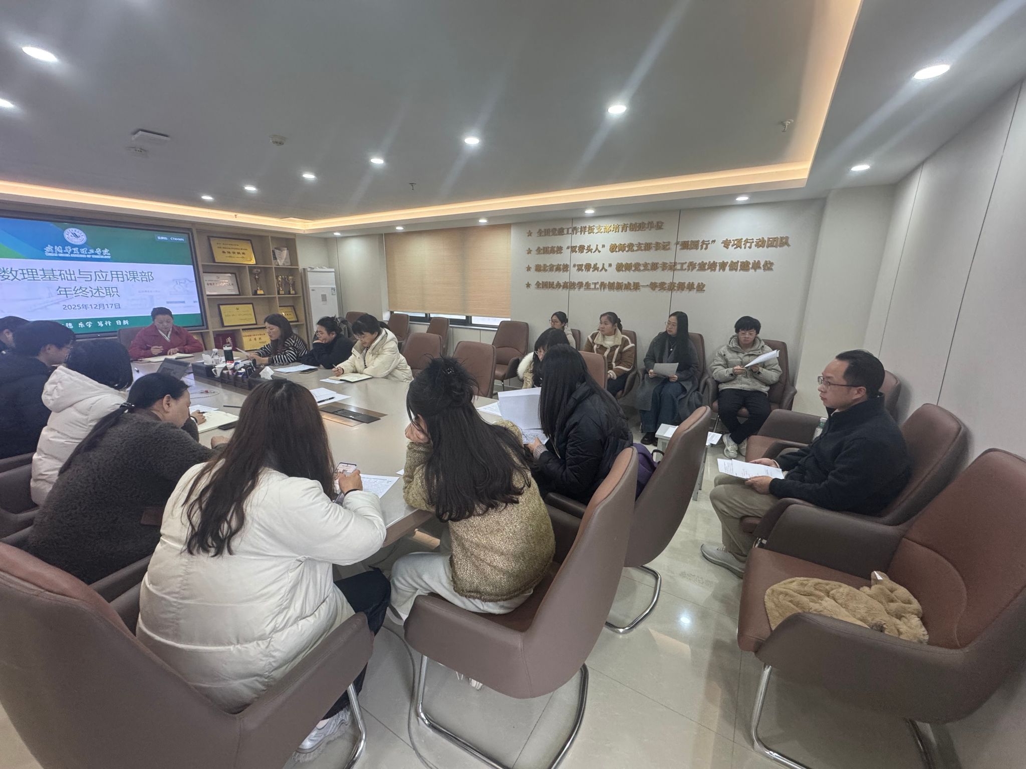 2025年12月17日下午,数理基础与应用课部年终述职会议在702会议室举行。会议全面回顾了过去一年课部在教学、管理、竞赛指导等方面的工作成果,总结经验、查摆不足,并对未来发展方向进行规划部署。课部全体教师参会,张平书记出席会议并作总结讲话,会议由课部王玉霞主任主持。
